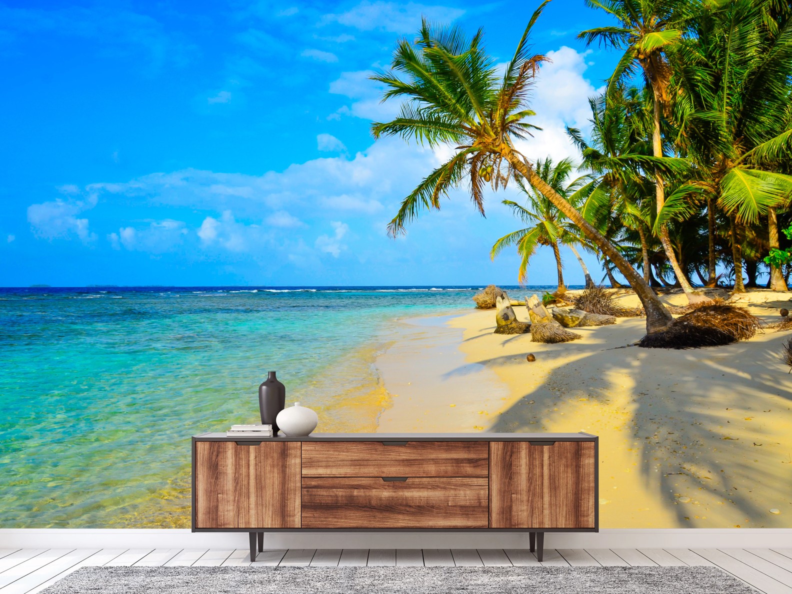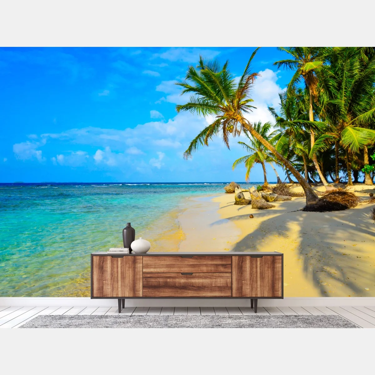 Helle tropische Strandaufnahme mit türkisfarbenem Wasser und wiegenden Palmen, die inselartige Gelassenheit in jeden Raum bringt.MehrWeniger