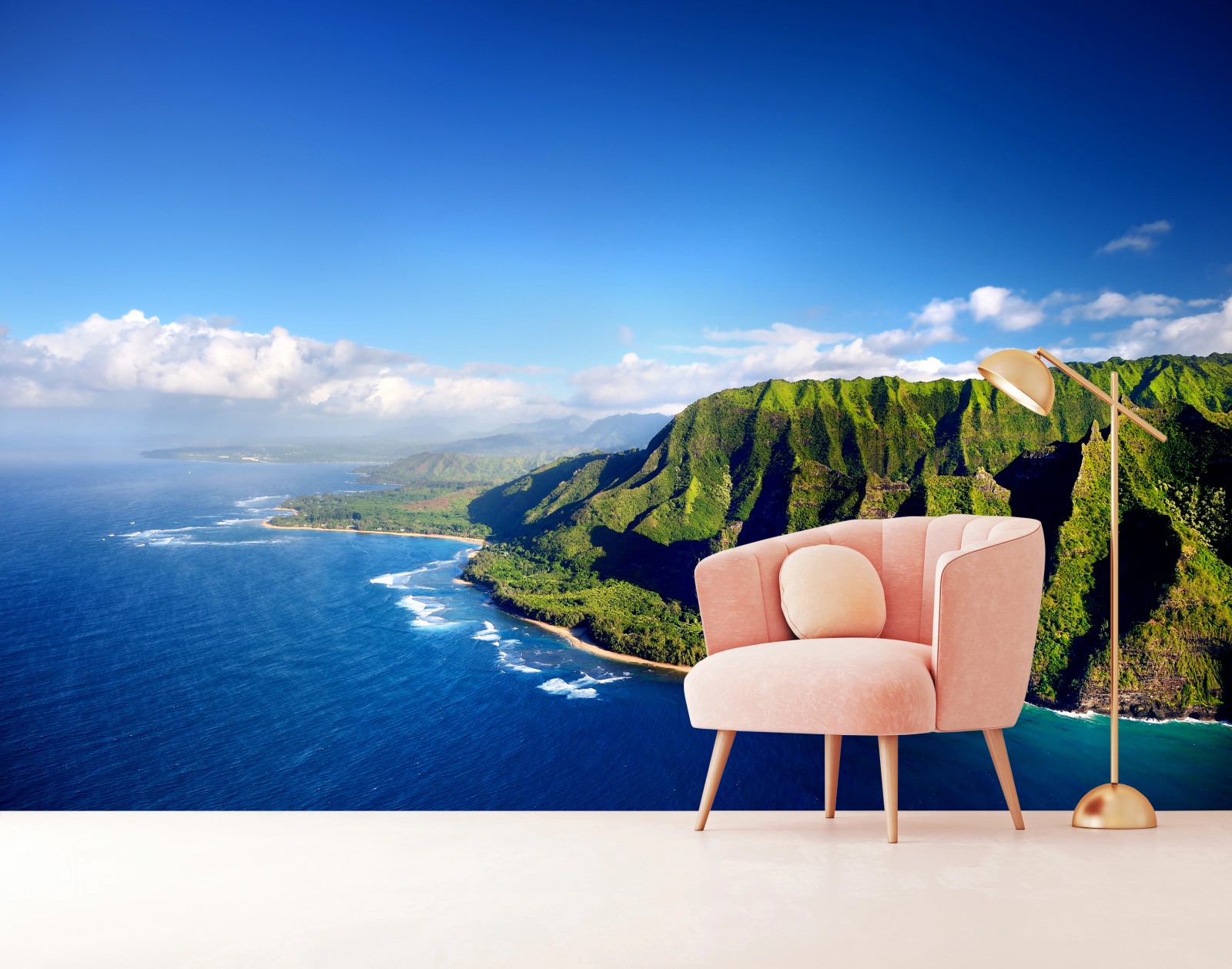atemberaubender panoramablick auf grüne klippen und tiefblaues meer bringt eine beruhigende, tropische atmosphäre in jeden raum.MehrWeniger