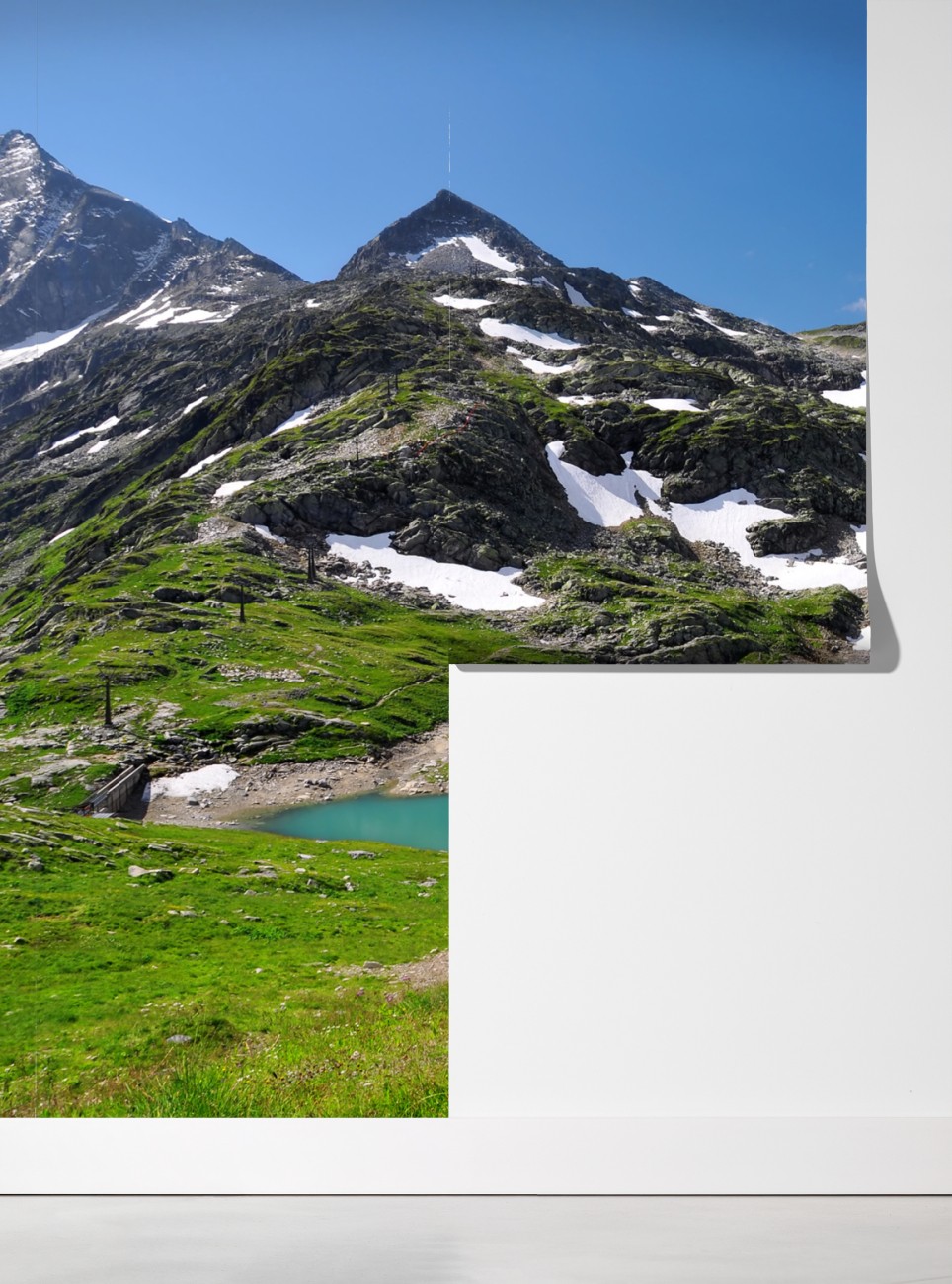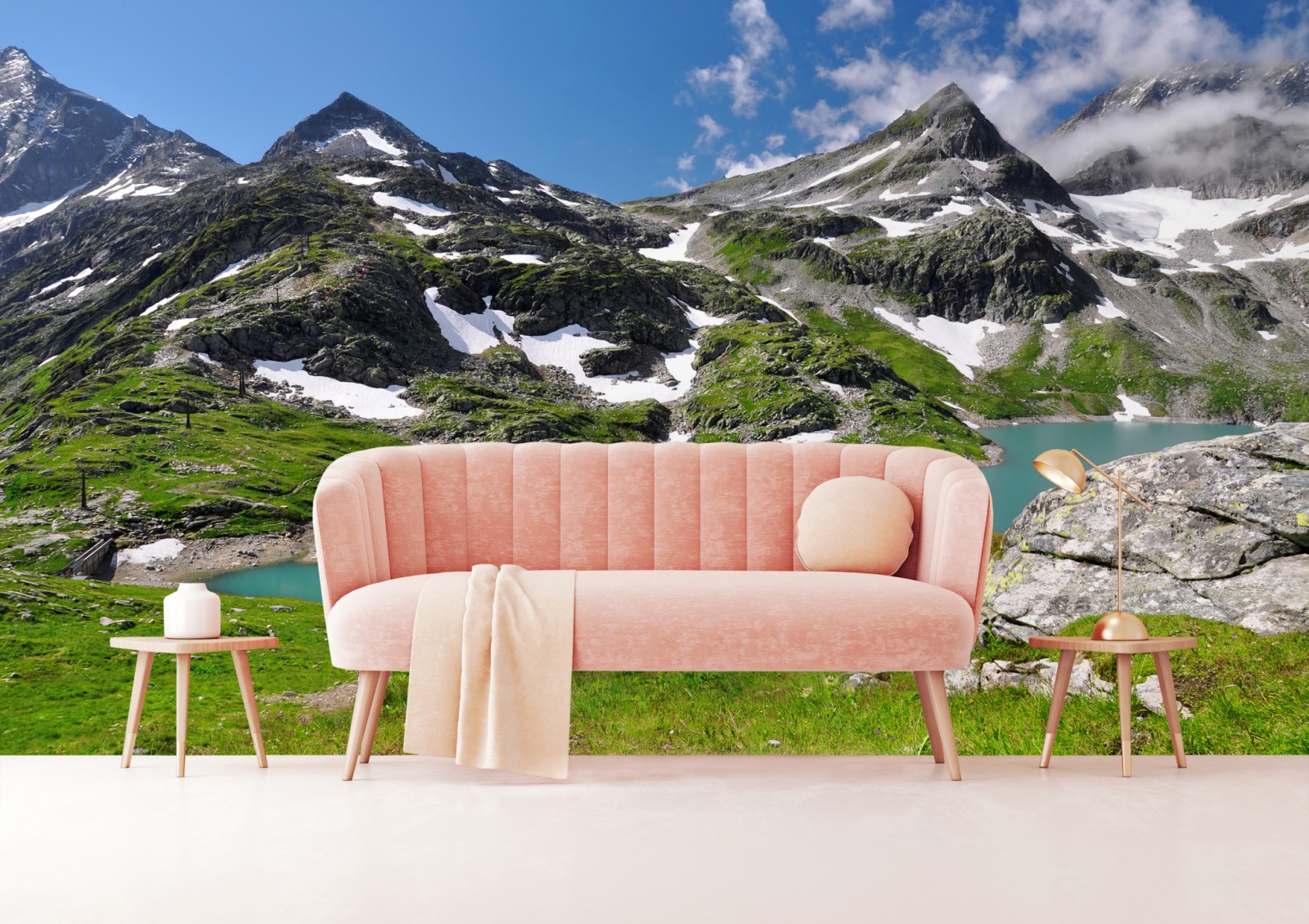 Atemberaubende Berglandschaft mit türkisfarbenem See, schneebedeckten Gipfeln und grünen Wiesen, die natürliches Flair in jeden Raum bringt.