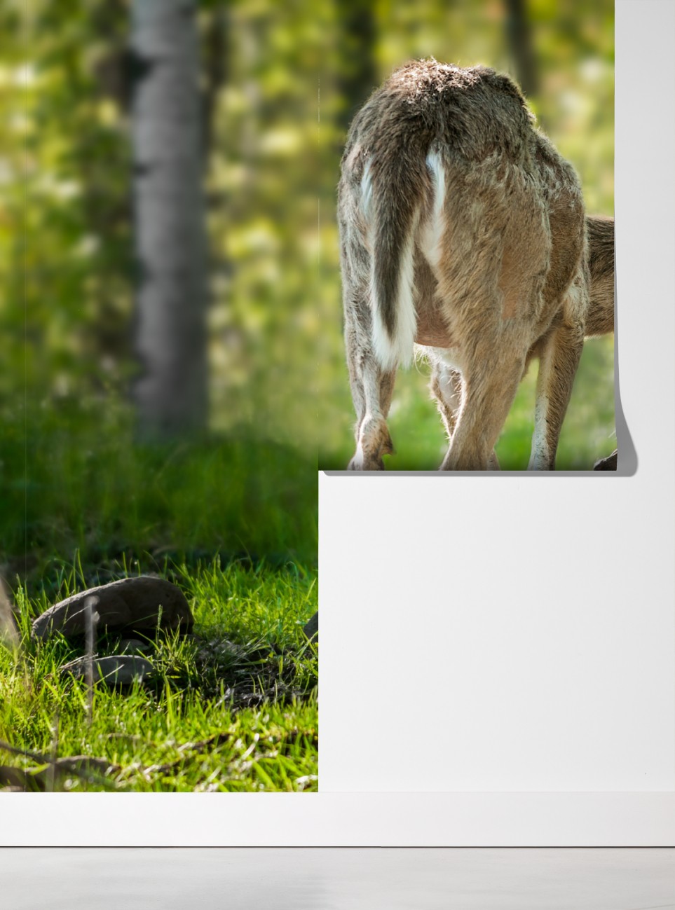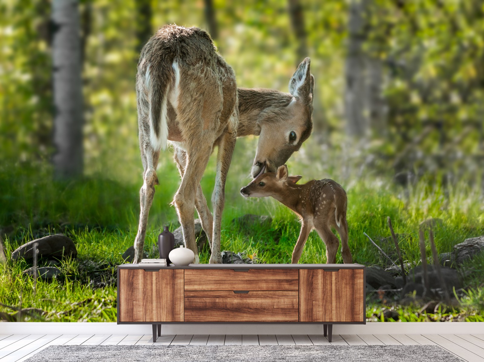 Ein zärtlicher Moment zwischen Hirsch und Kitz im sonnigen Wald, der Ruhe und Natur in Ihr Zuhause bringt.