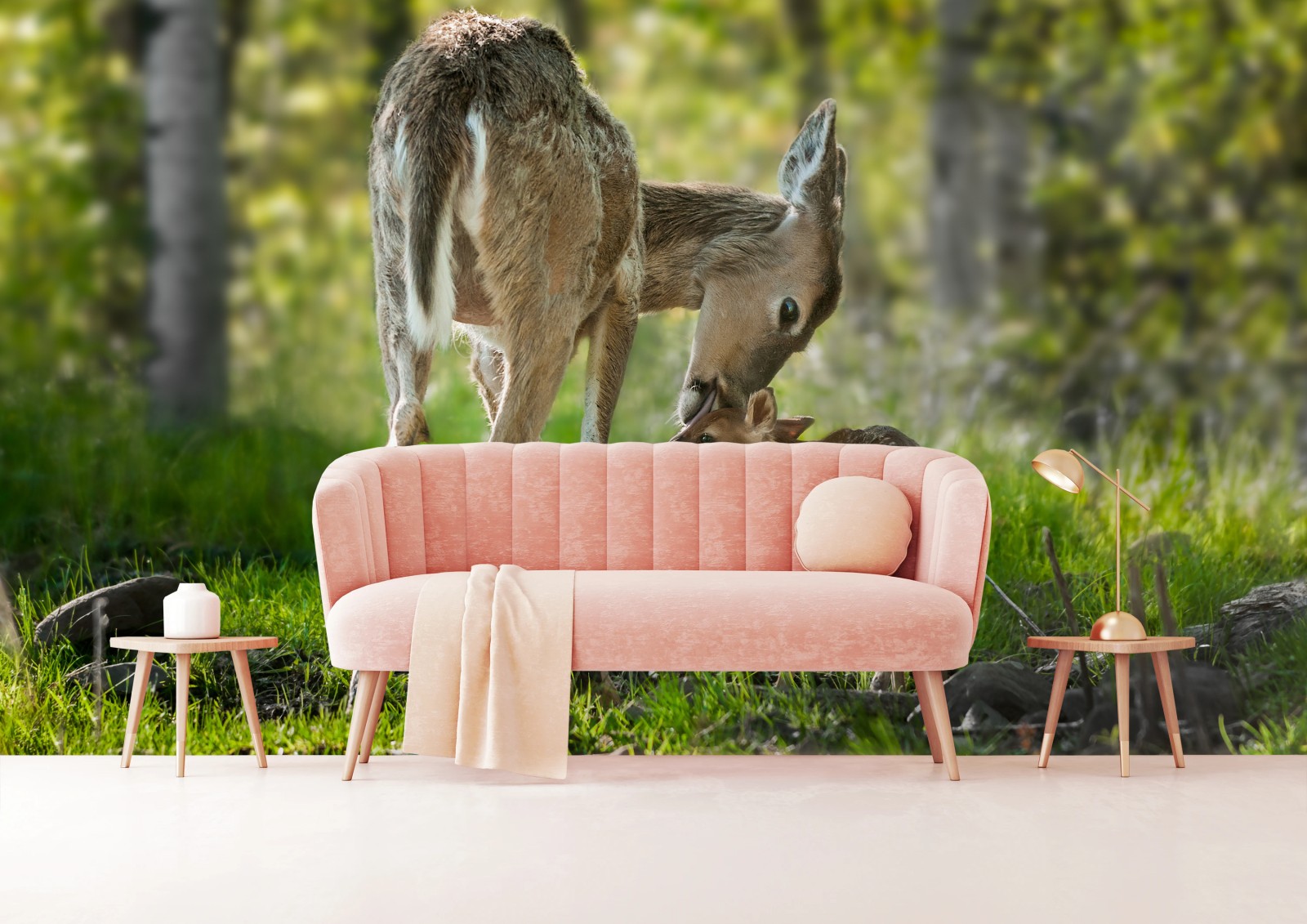 Ein zärtlicher Moment zwischen Hirsch und Kitz im sonnigen Wald, der Ruhe und Natur in Ihr Zuhause bringt.MehrWeniger