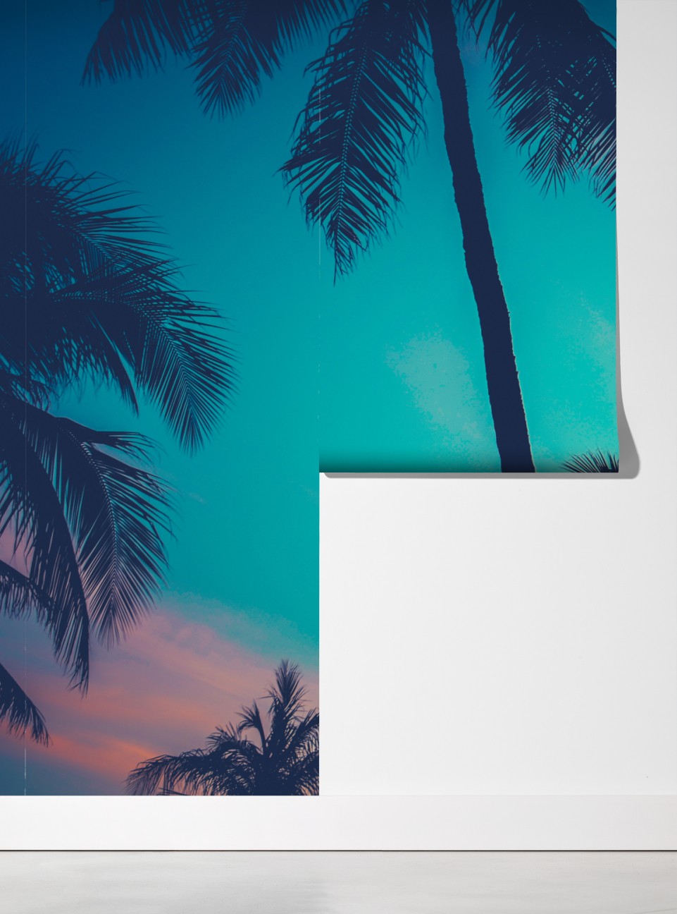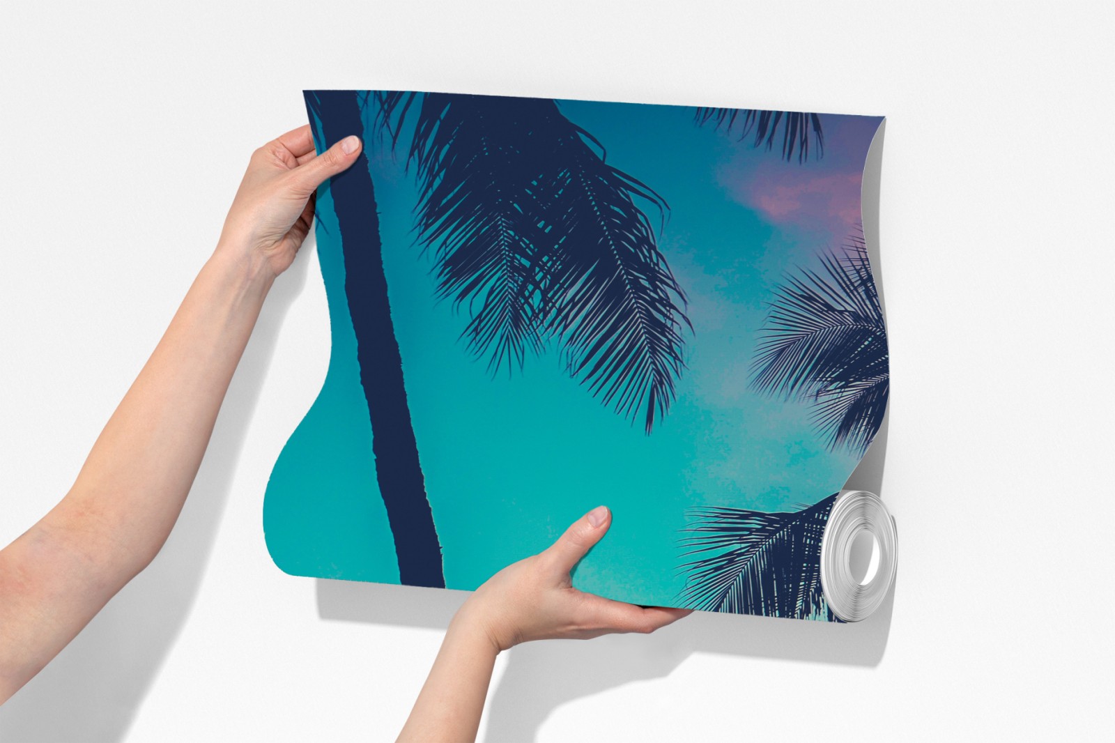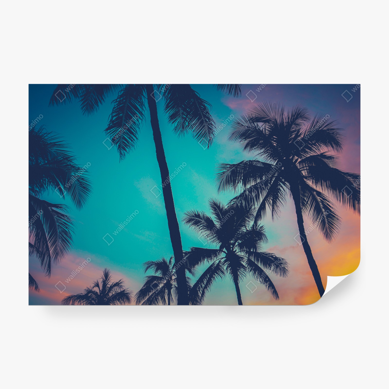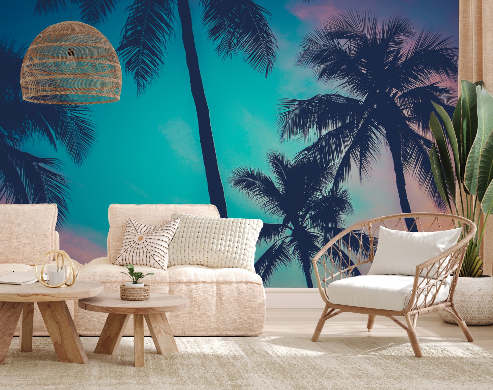 Bringen Sie tropisches Flair in Ihr Zuhause mit retro-gefilterten Palmen-Silhouetten vor einem türkisfarbenen Sonnenuntergang.