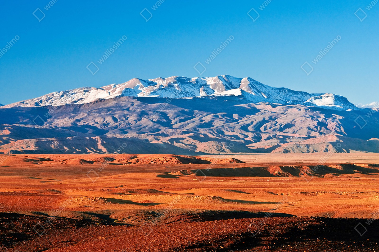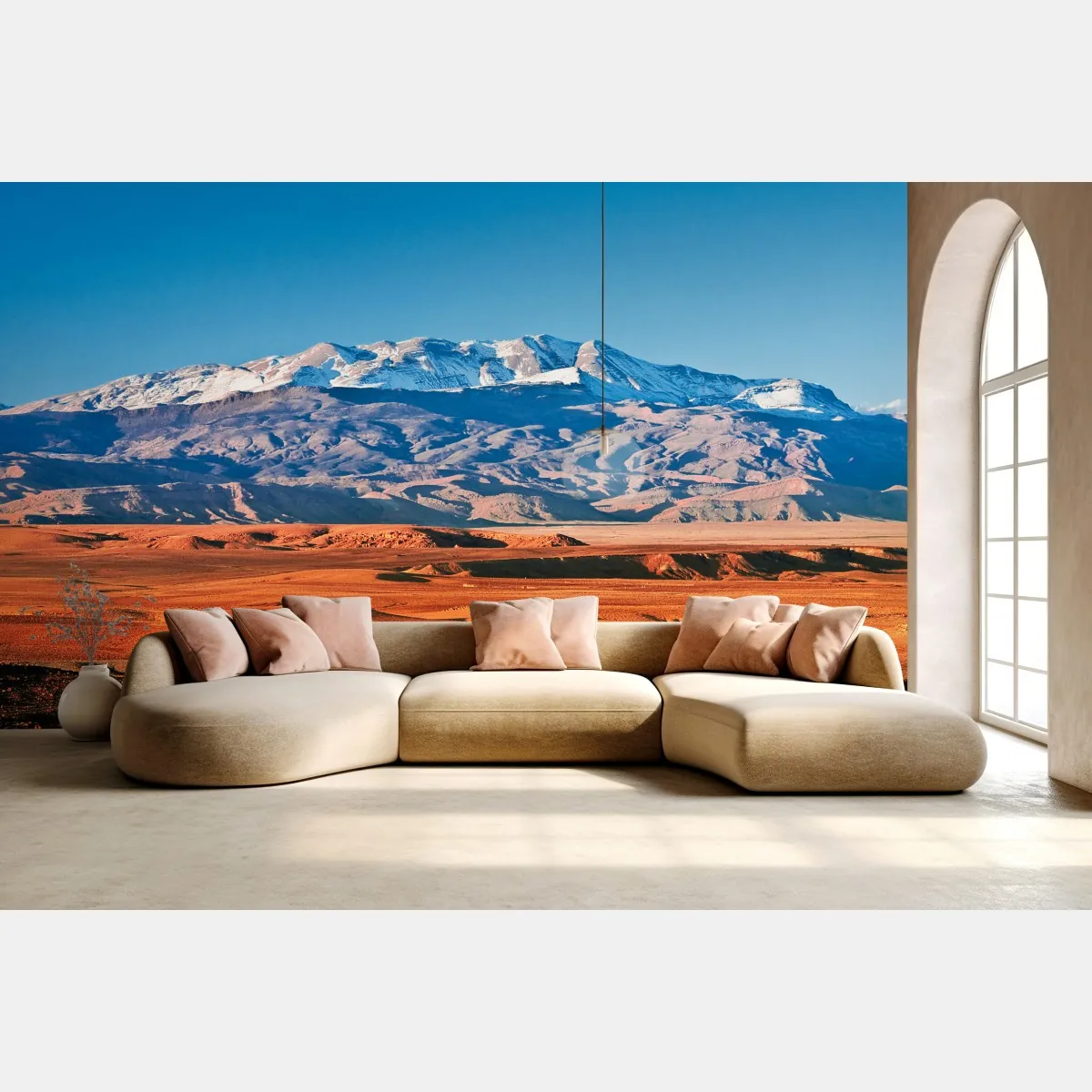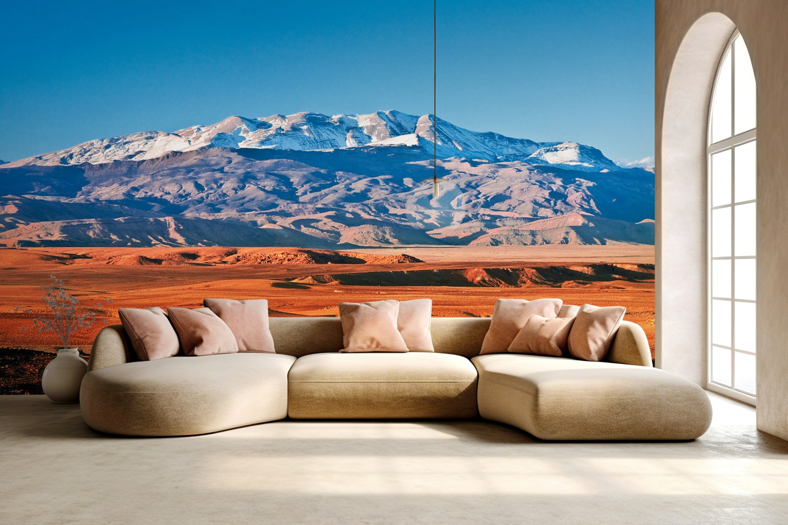 Beeindruckende Panoramaansicht sonnenbeschienener Wüstenebenen, die zu schneebedeckten Bergen unter klarem blauem Himmel führen, ideal, um Räumen Wärme und Tiefe zu verleihen.