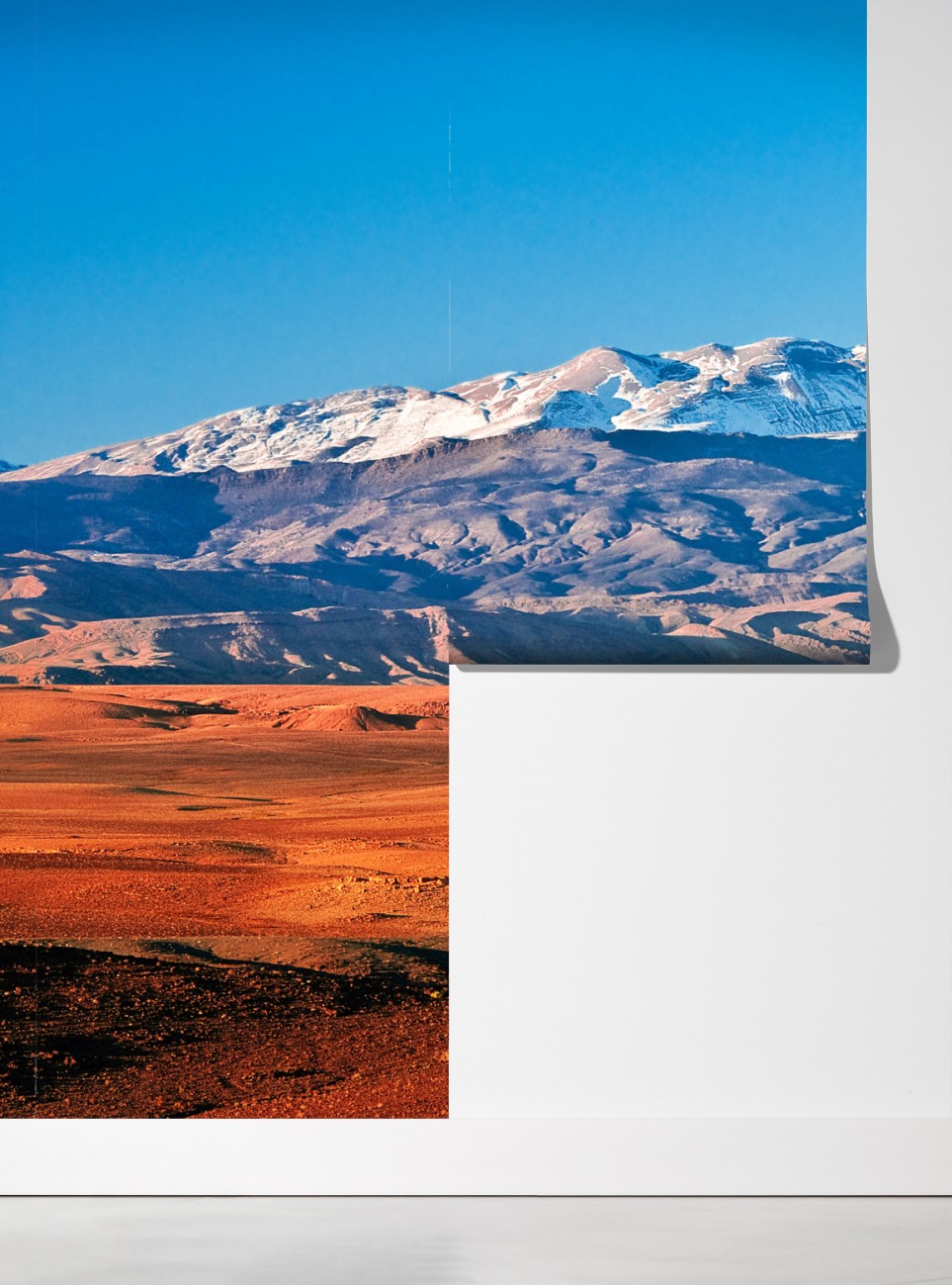 Fototapete sonnenbeschienene wüste mit schneebedeckten bergen – Wallnifity®