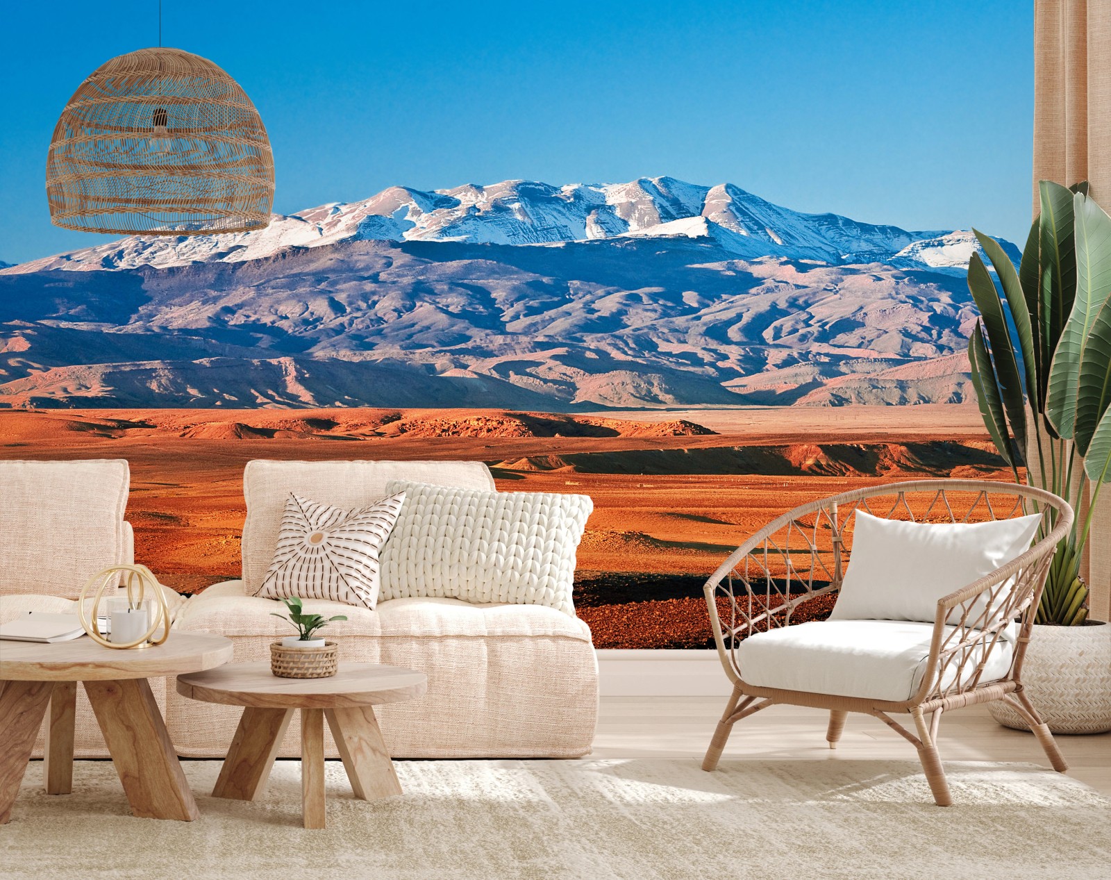 Fototapete Sonnenbeschienene wüste mit schneebedeckten bergen