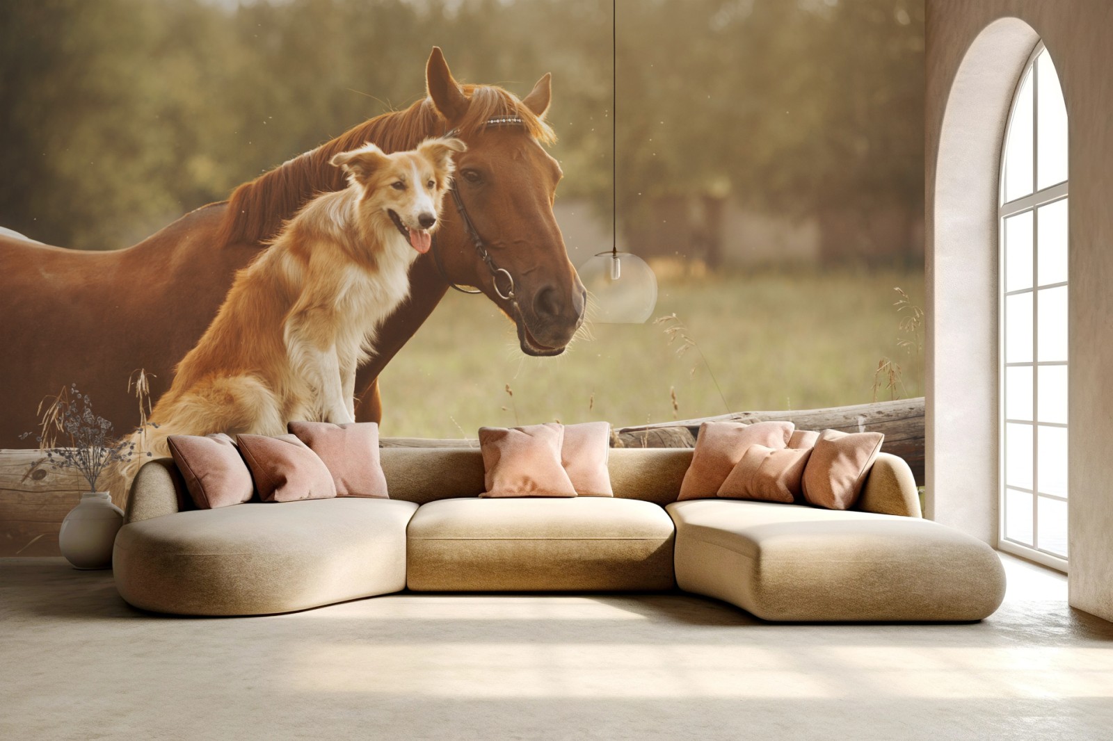 Ein warmes, sonnendurchflutetes Porträt von Hund und Pferd in idyllischer ländlicher Umgebung, ideal um rustikalen Charme und natürliche Wärme an die Wand zu bringen.MehrWeniger
