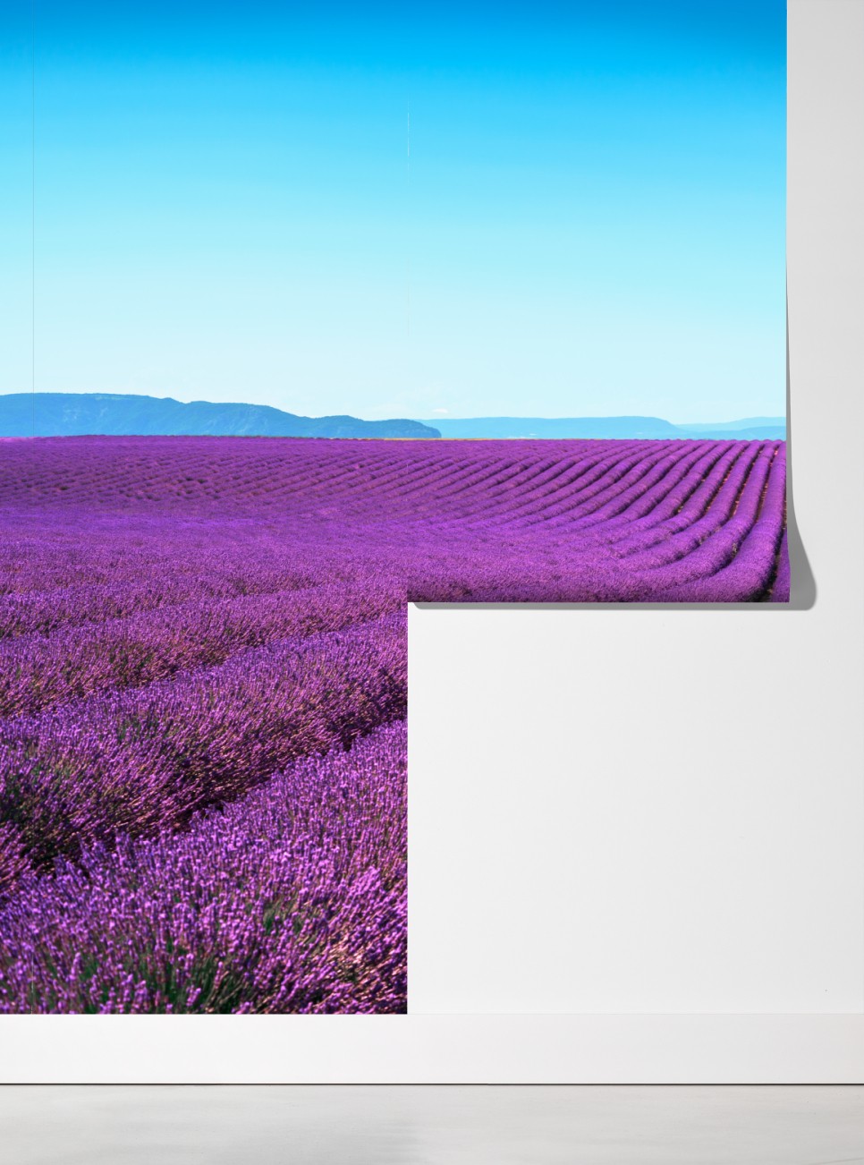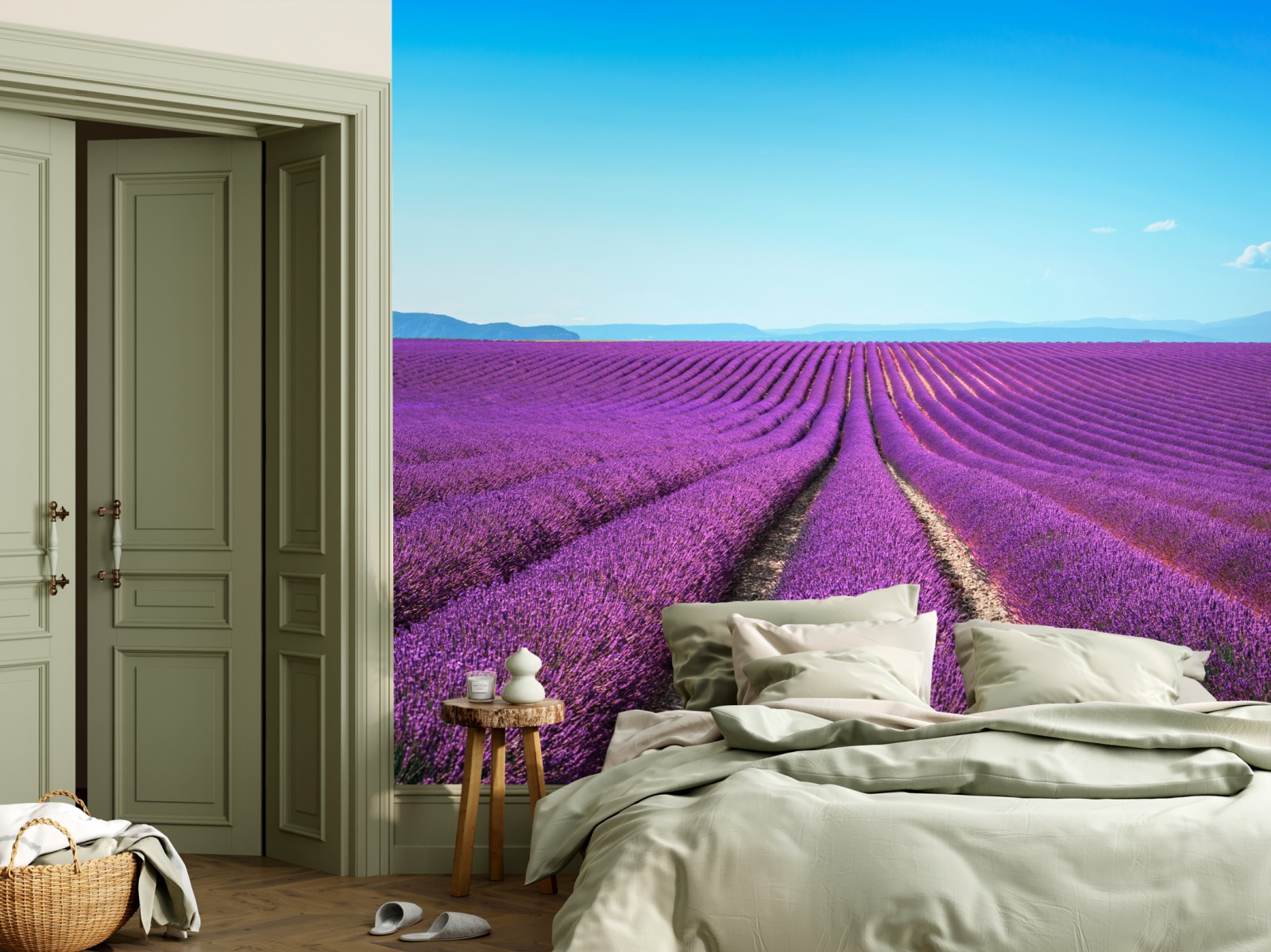 Weite Lavendelfelder erstrecken sich bis zum Horizont unter klarem blauem Himmel und bringen beruhigende violette Töne sowie natürliche Schönheit in den Raum.