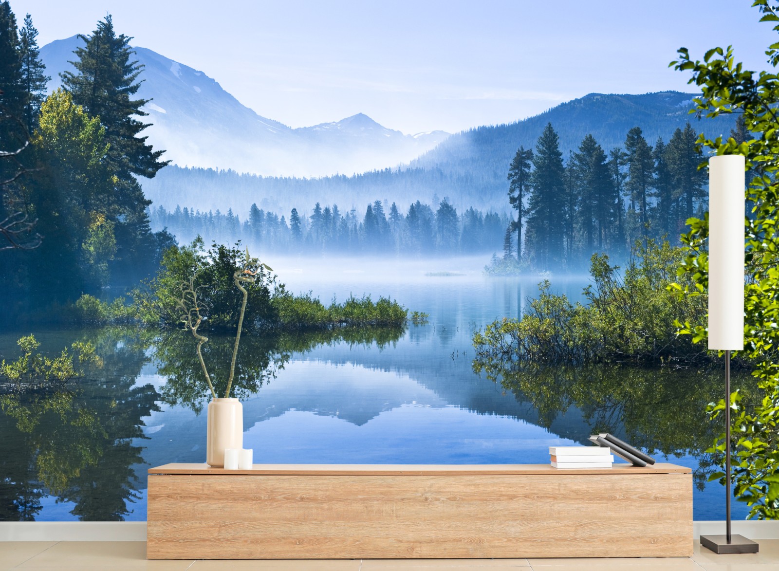 Ein ruhiger, nebelverhangener Bergsee mit klarer Spiegelung und dichtem Kiefernwald, perfekt als beruhigendes Wandbild.