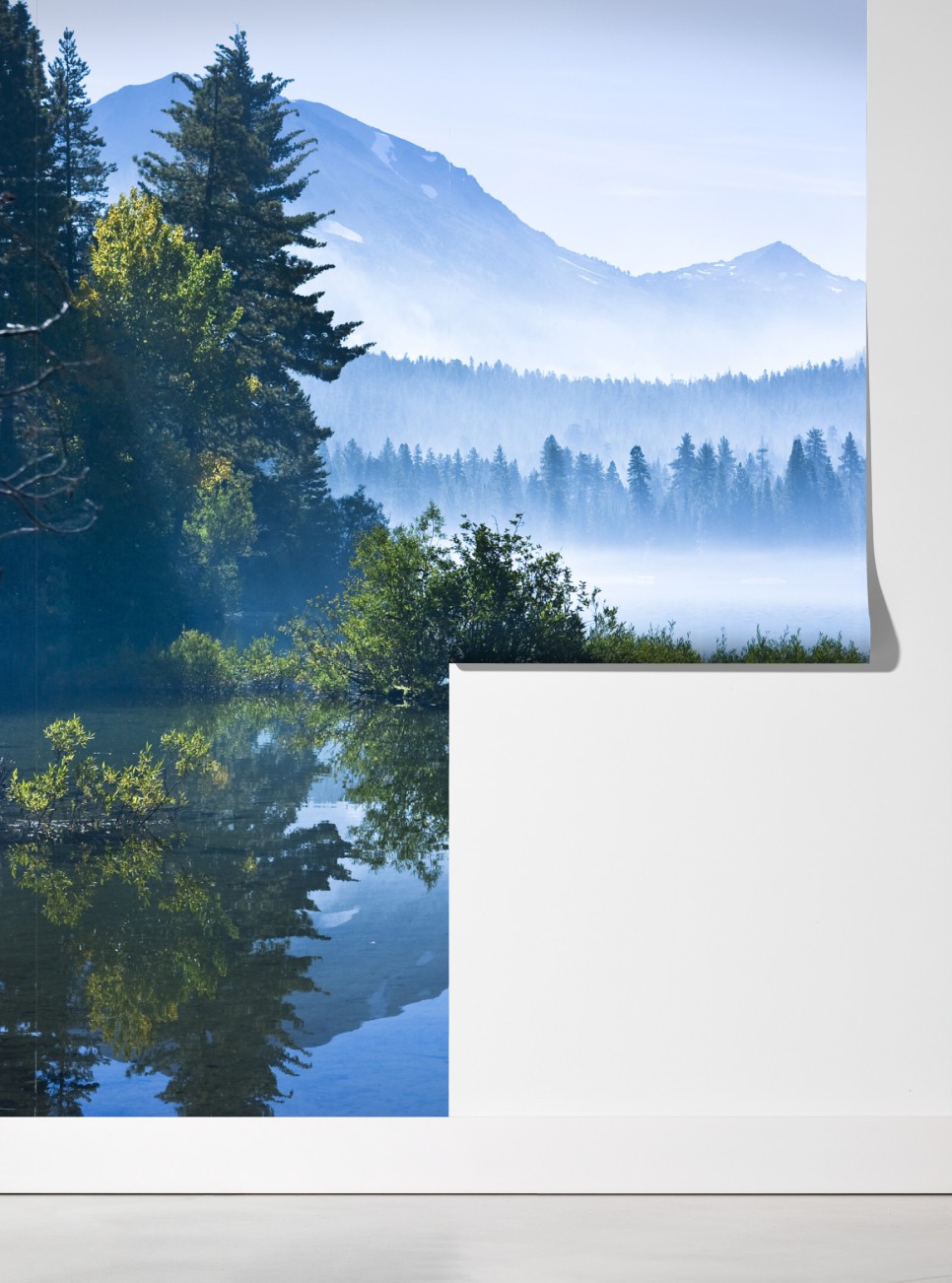 Fototapete nebliger bergsee mit spiegelnder oberfläche