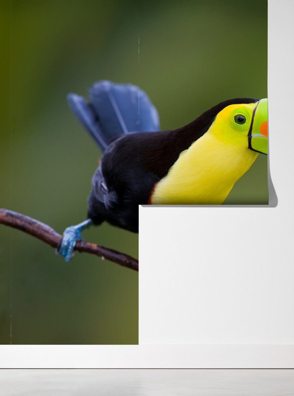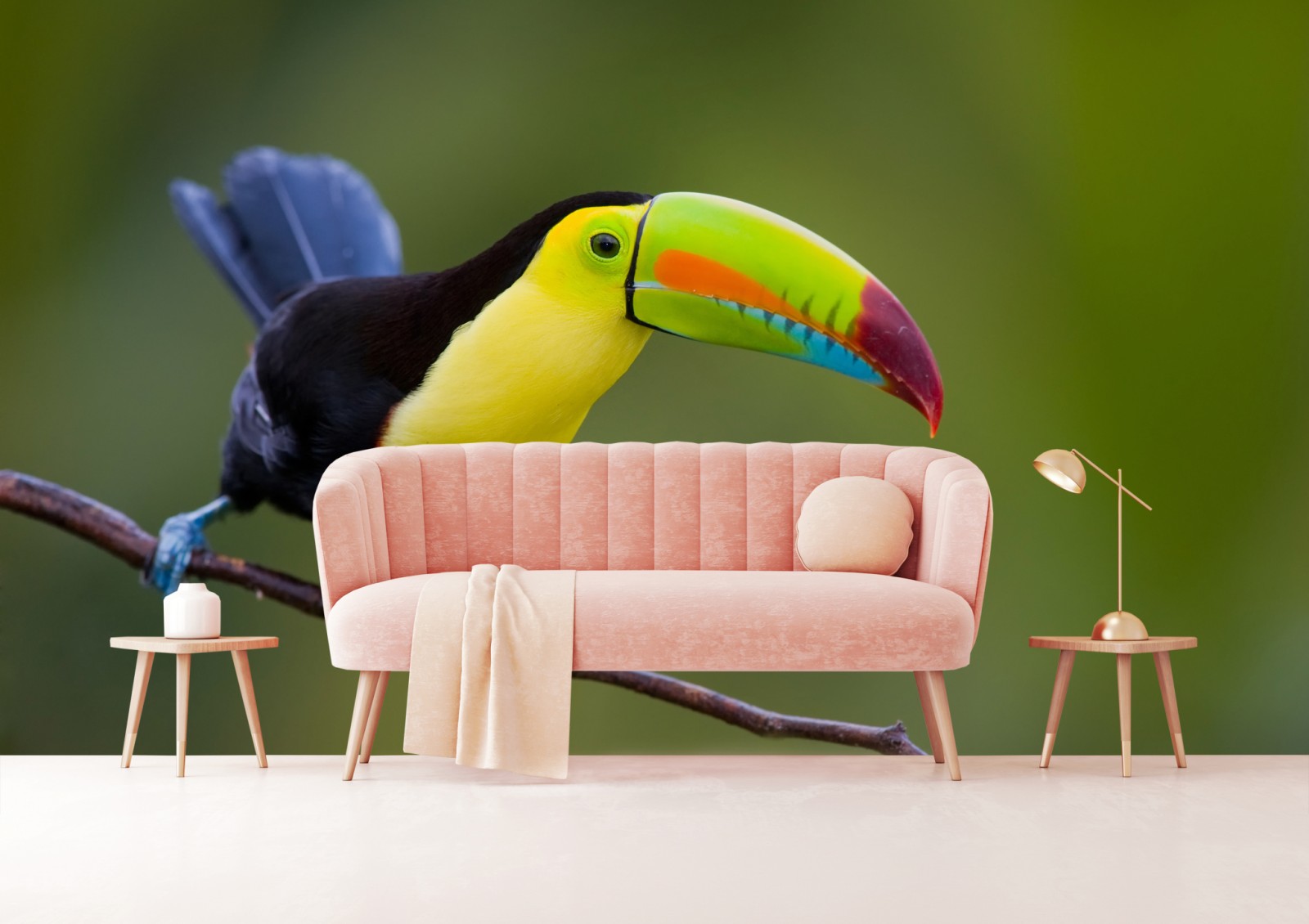 Nahaufnahme eines bunten Tukans auf einem Ast, die tropische Energie und lebendige Farben in jeden Raum bringt.