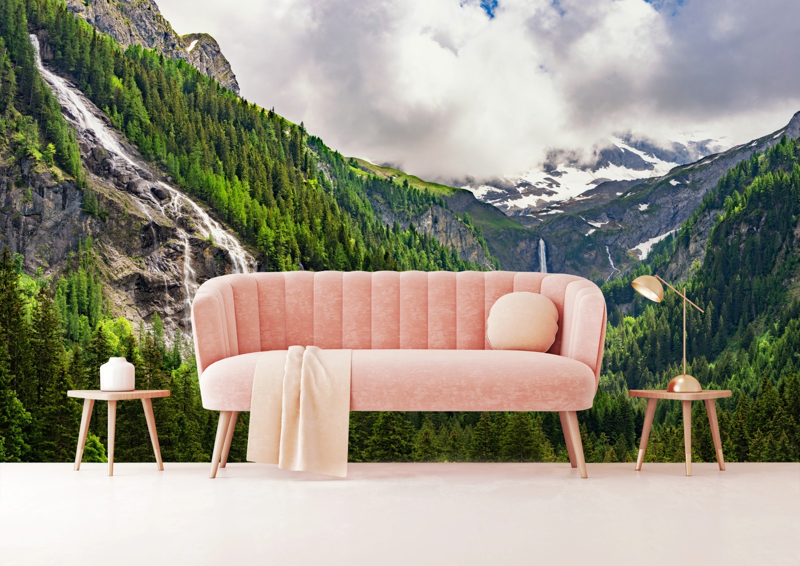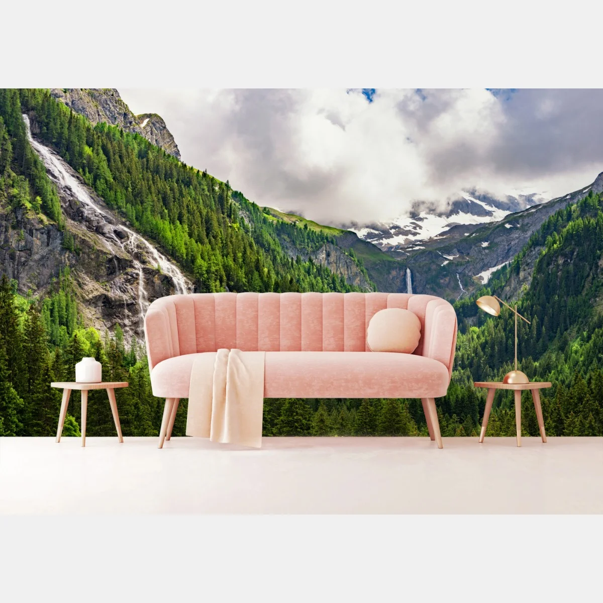Fototapete Nebelverhangener alpenwasserfall über grüner waldschlucht