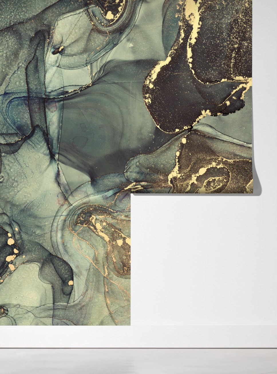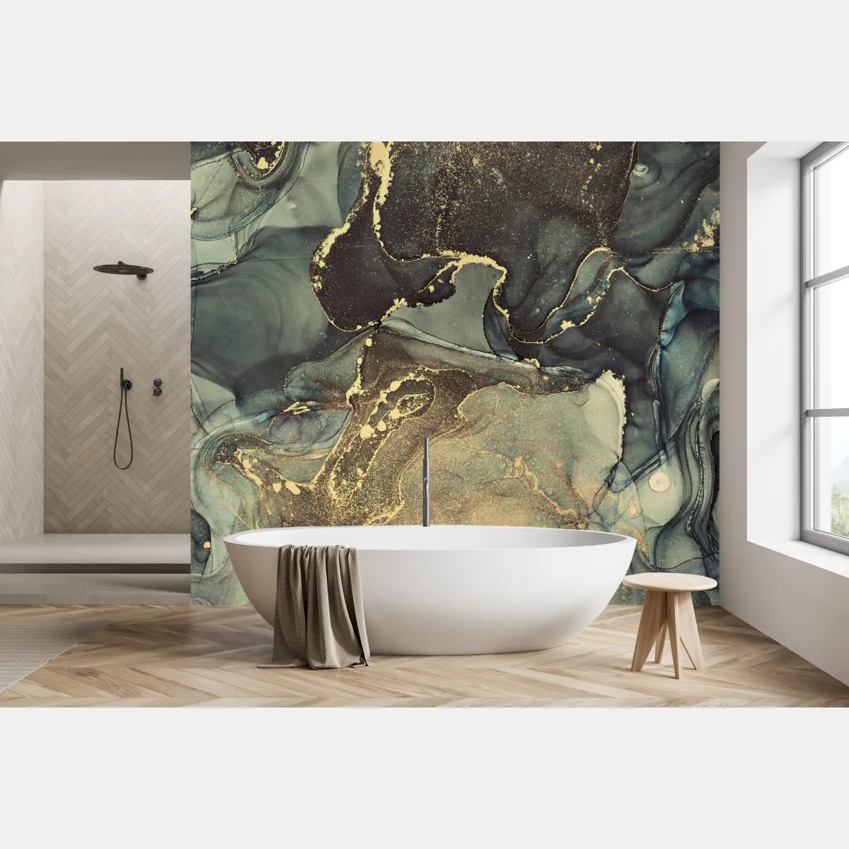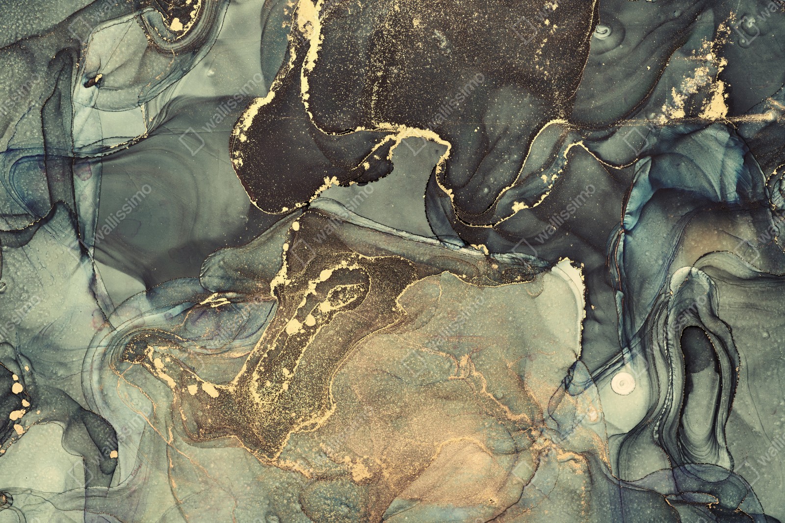 Elegante türkis-goldene fließende abstraktion mit schimmernden akzenten verleiht modernen räumen einen luxuriösen, verträumten touch.