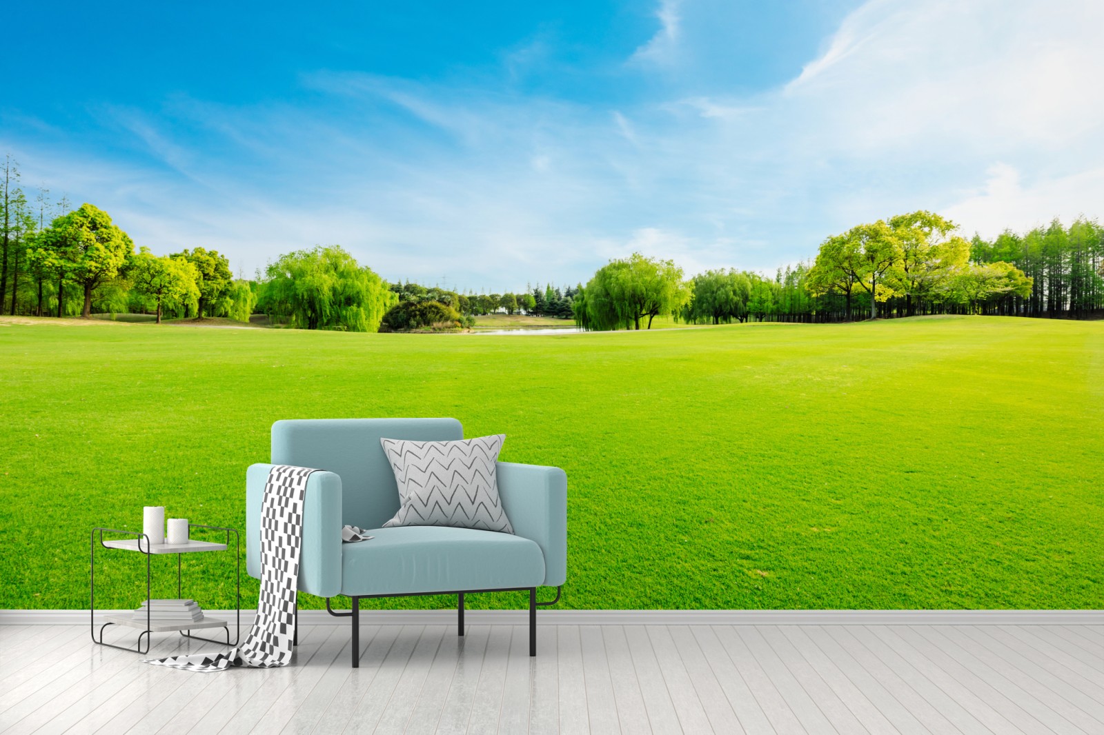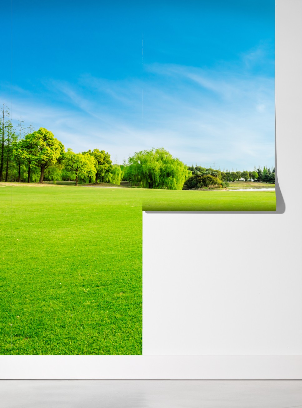 Lebhafte Frühlingswiese, die Ruhe und frische Natur ins Zuhause bringt.