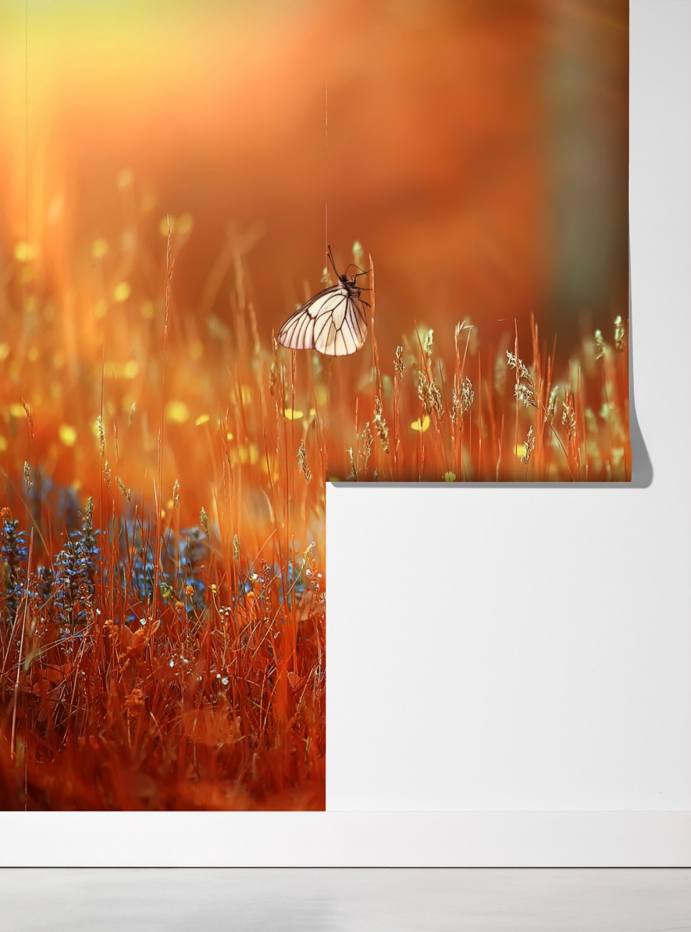 Eine träumerische Nahaufnahme eines Schmetterlings über wilden Blumen im warmen, goldenen Licht, ideal um jedem Raum natürliche Romantik zu verleihen.