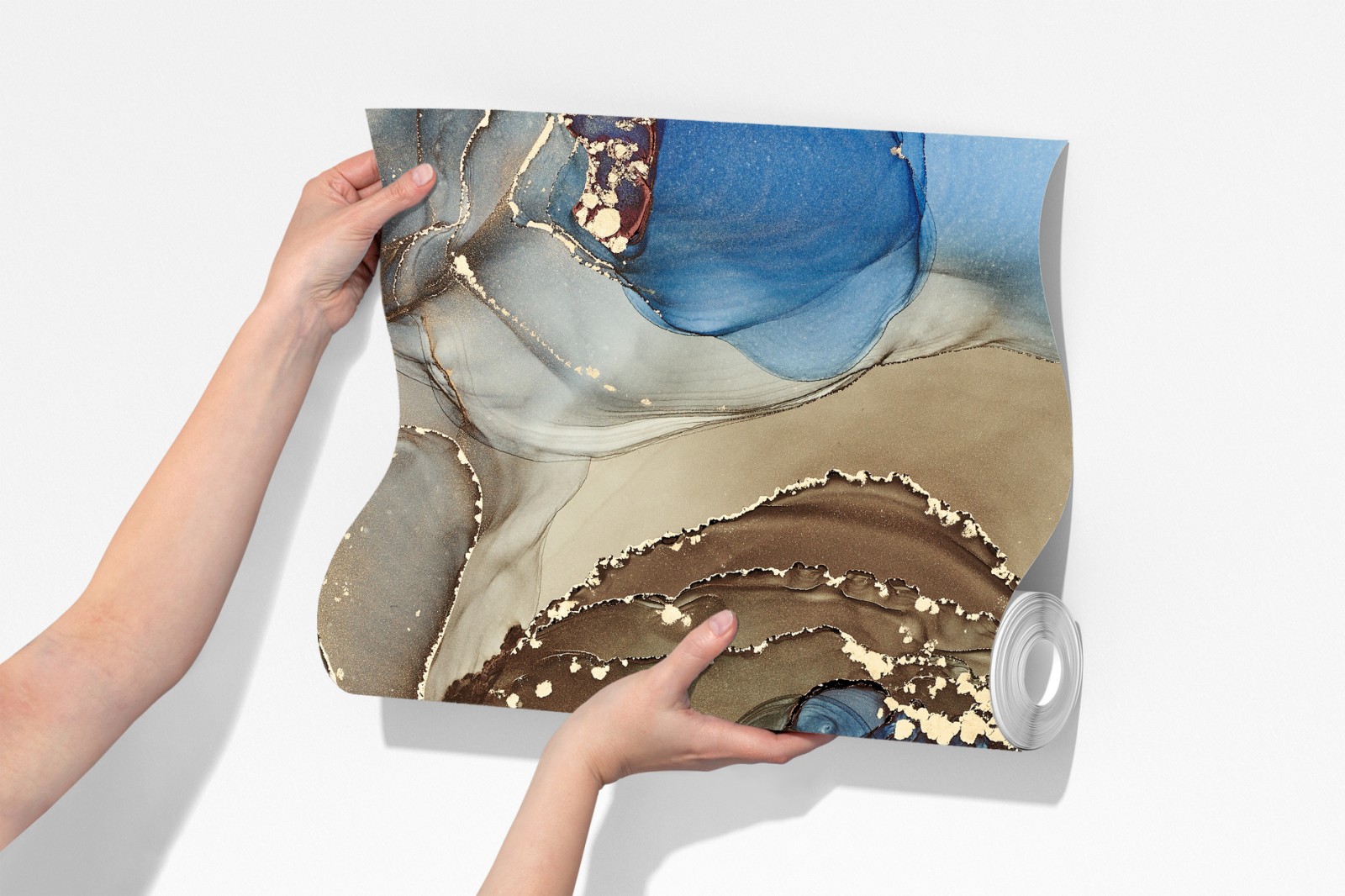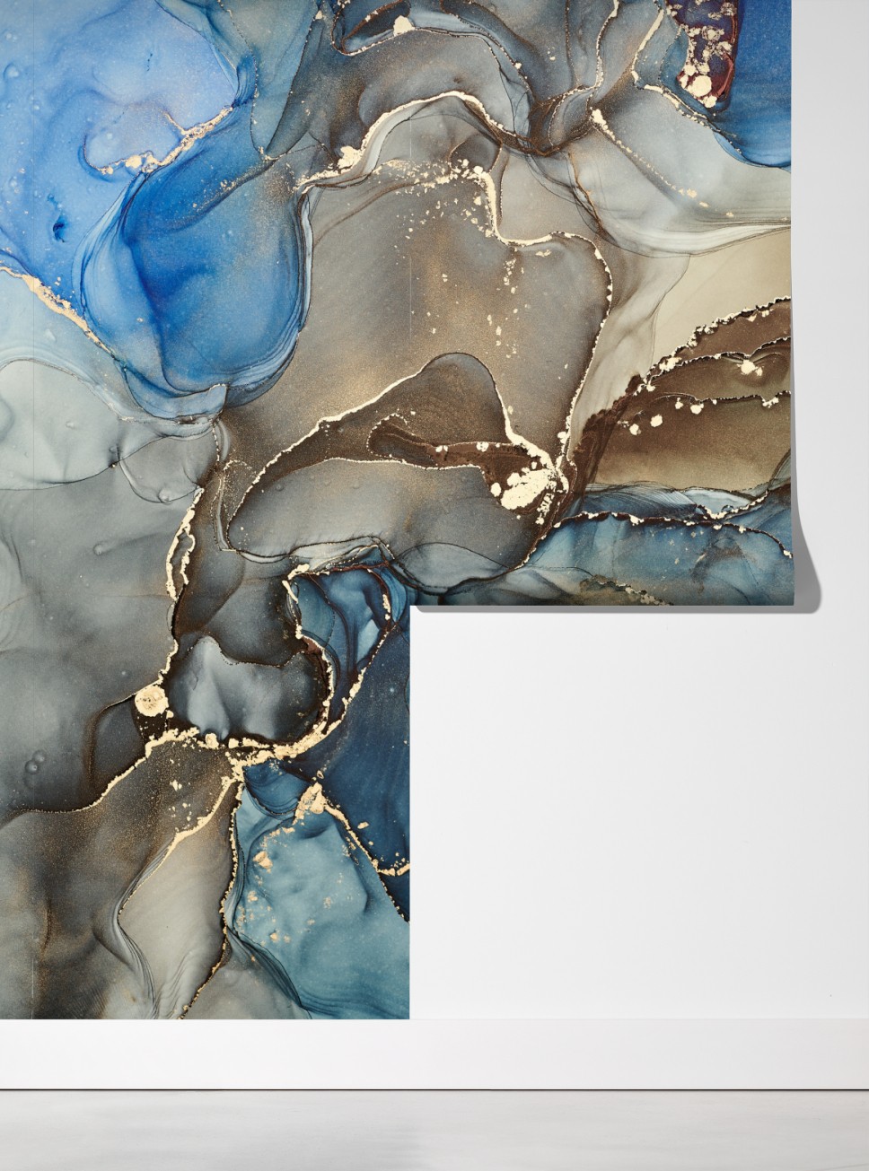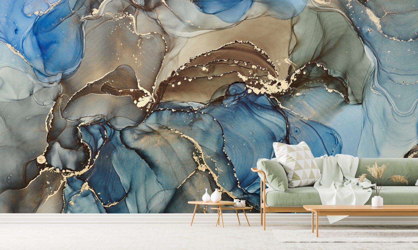 Luxuriöse Alcohol-Ink-Abstraktion mit tiefen Blautönen und goldenen Akzenten, die eine ruhige, fließende Komposition für moderne Innenräume schafft.