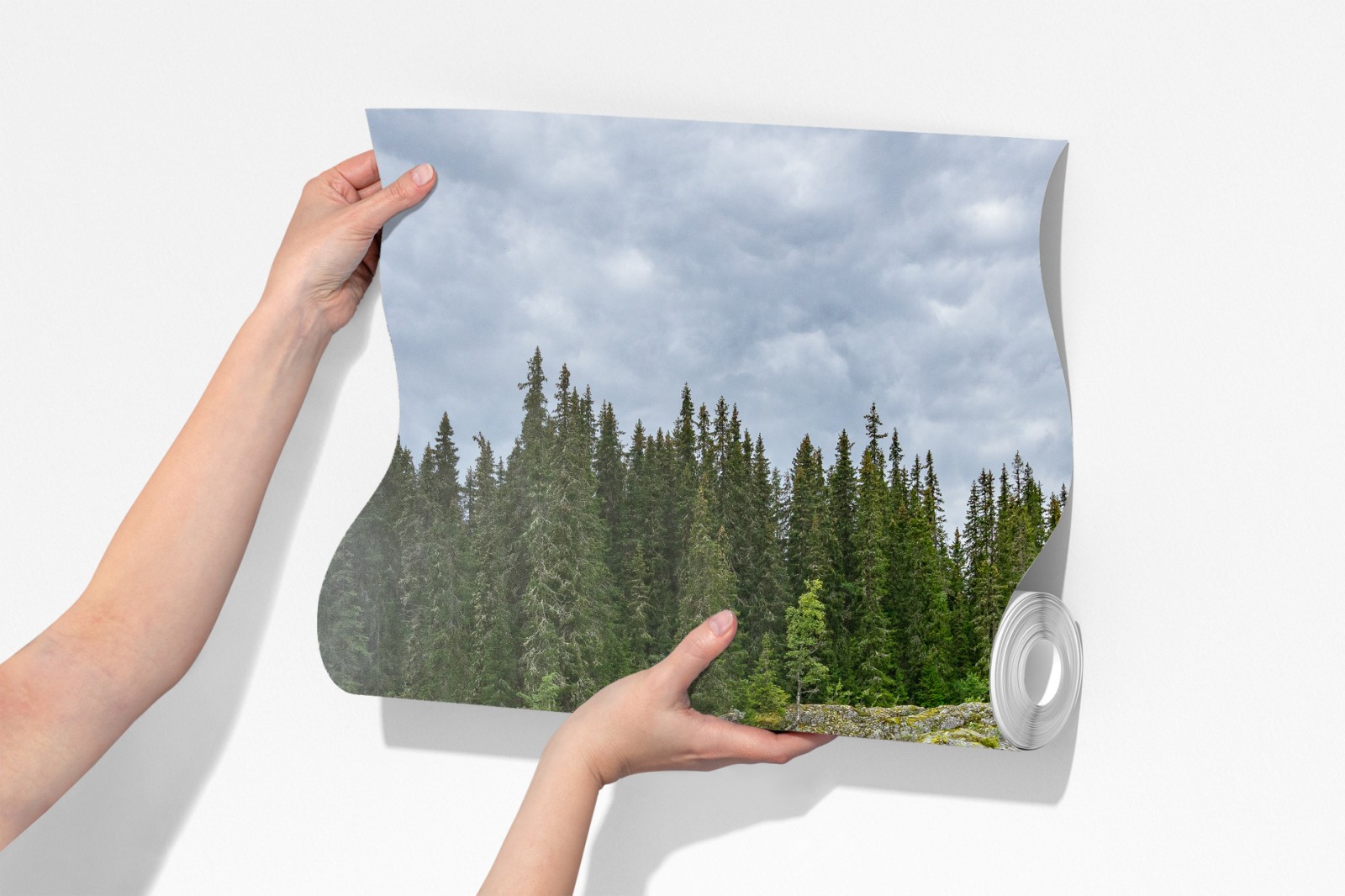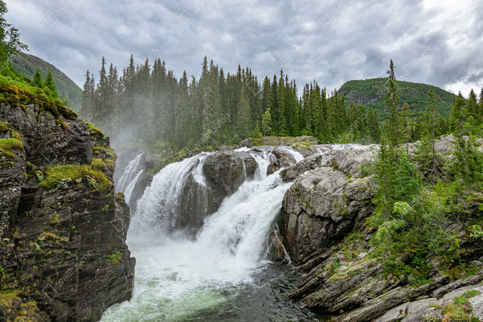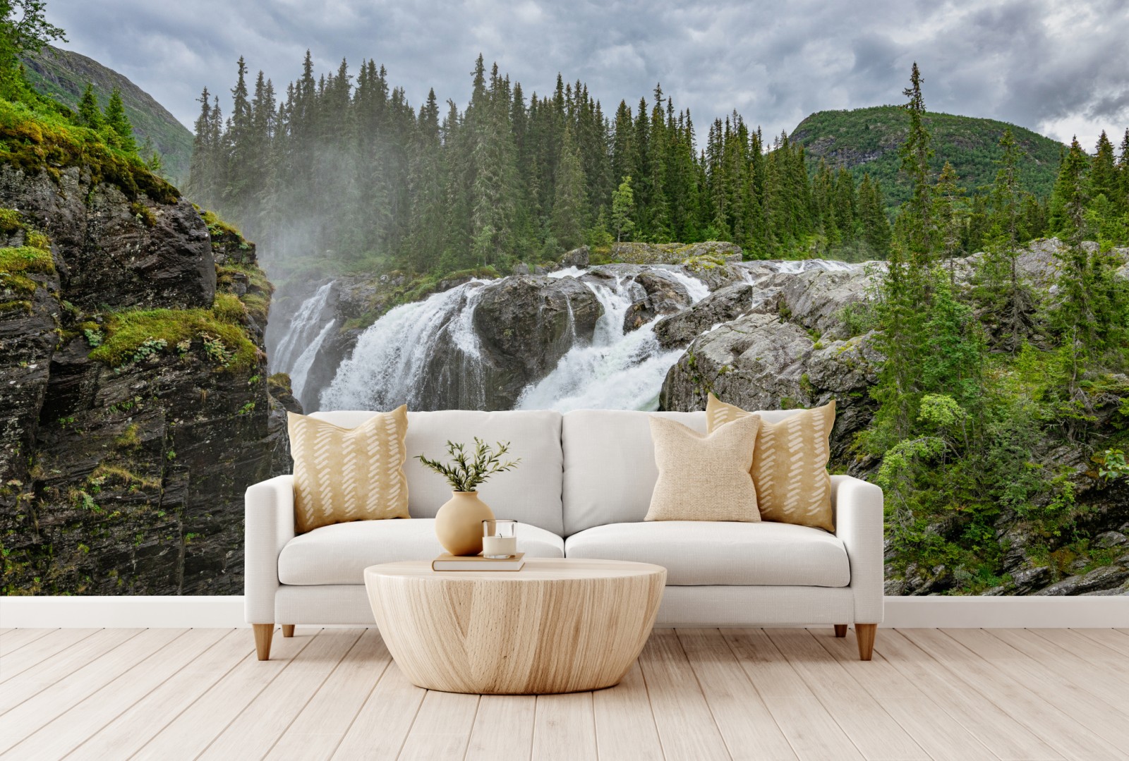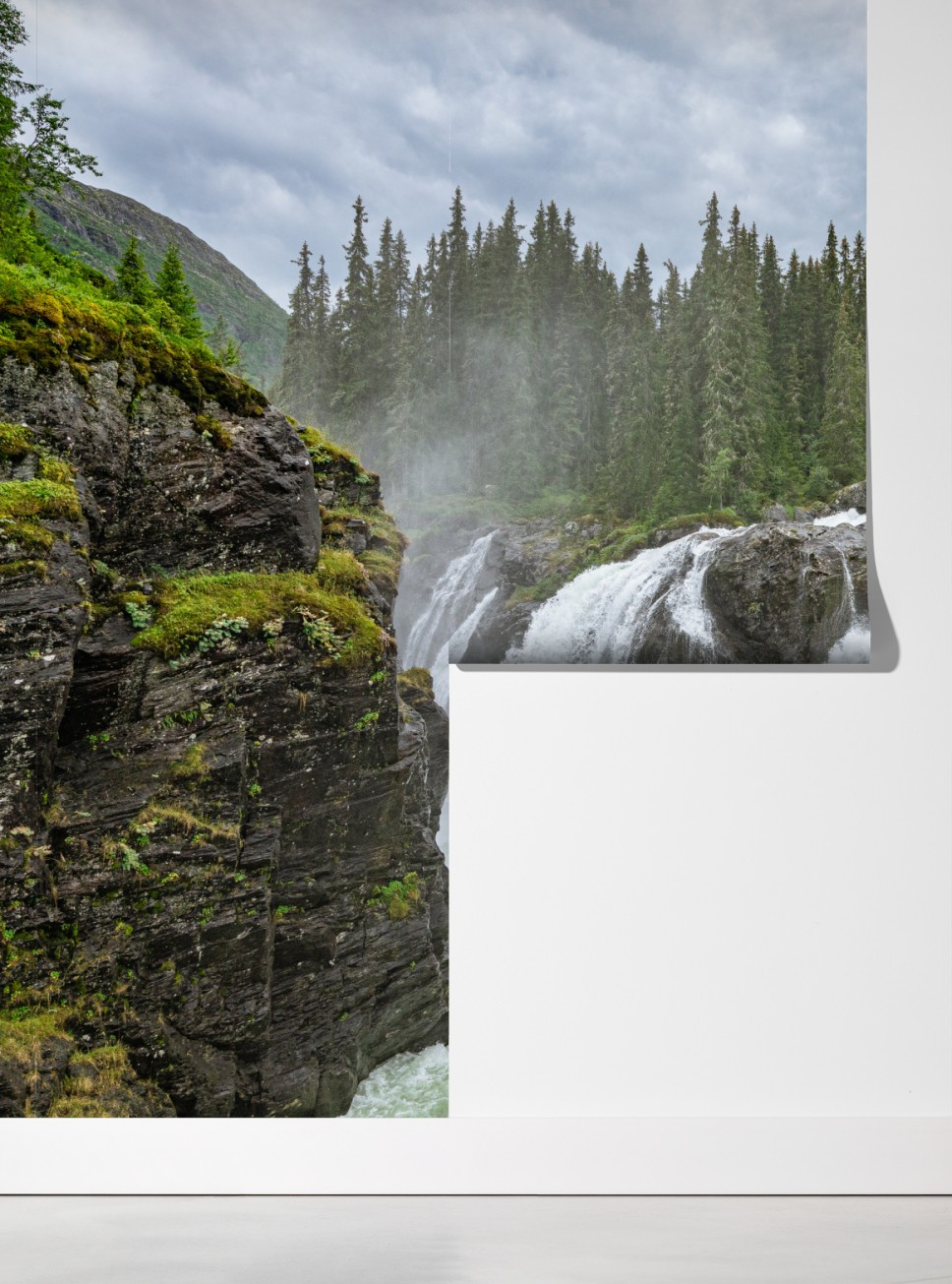 Fototapete nebliger wasserfall im dichten kiefernwald – Wallnifity®