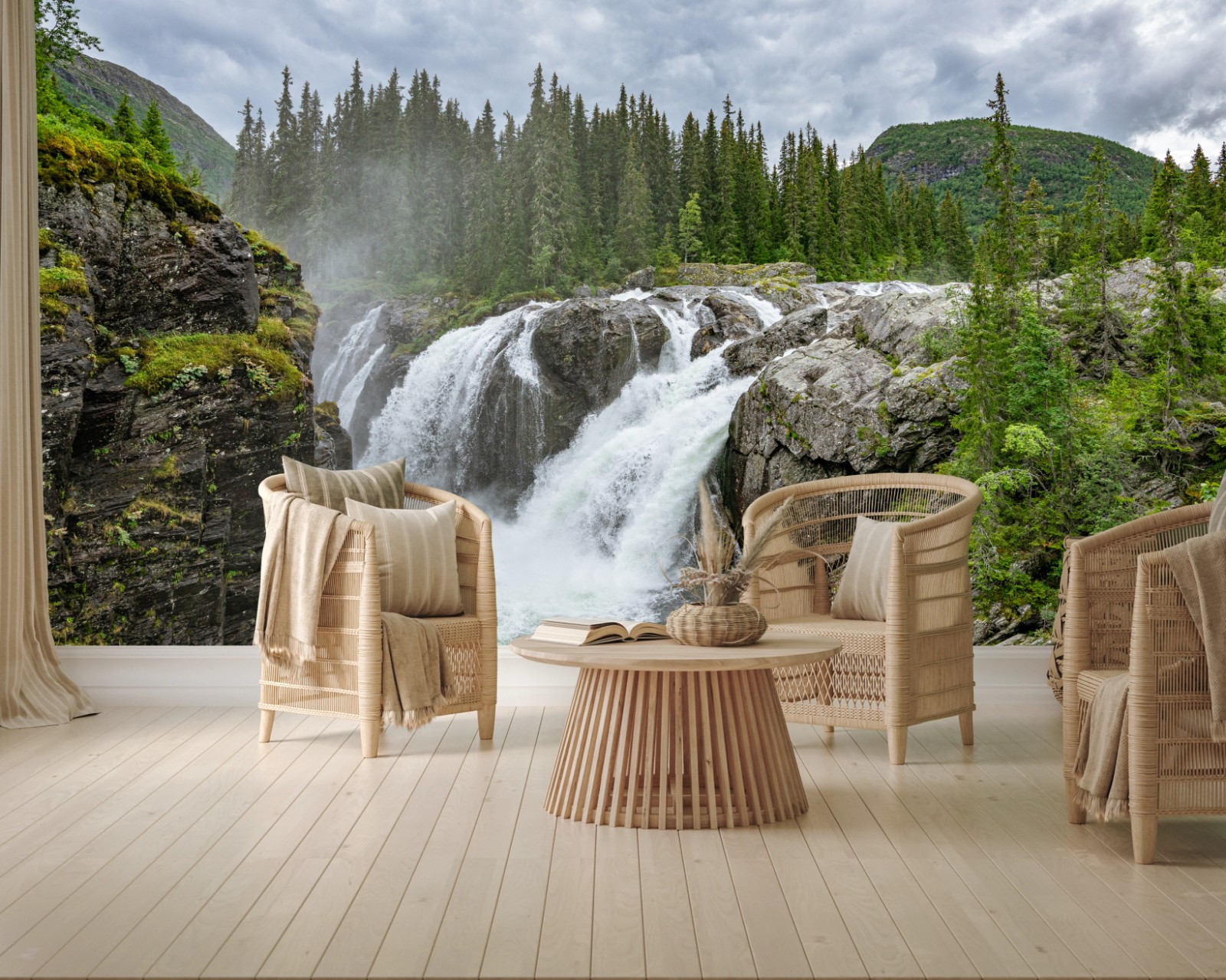 Fototapete Nebliger wasserfall im dichten kiefernwald