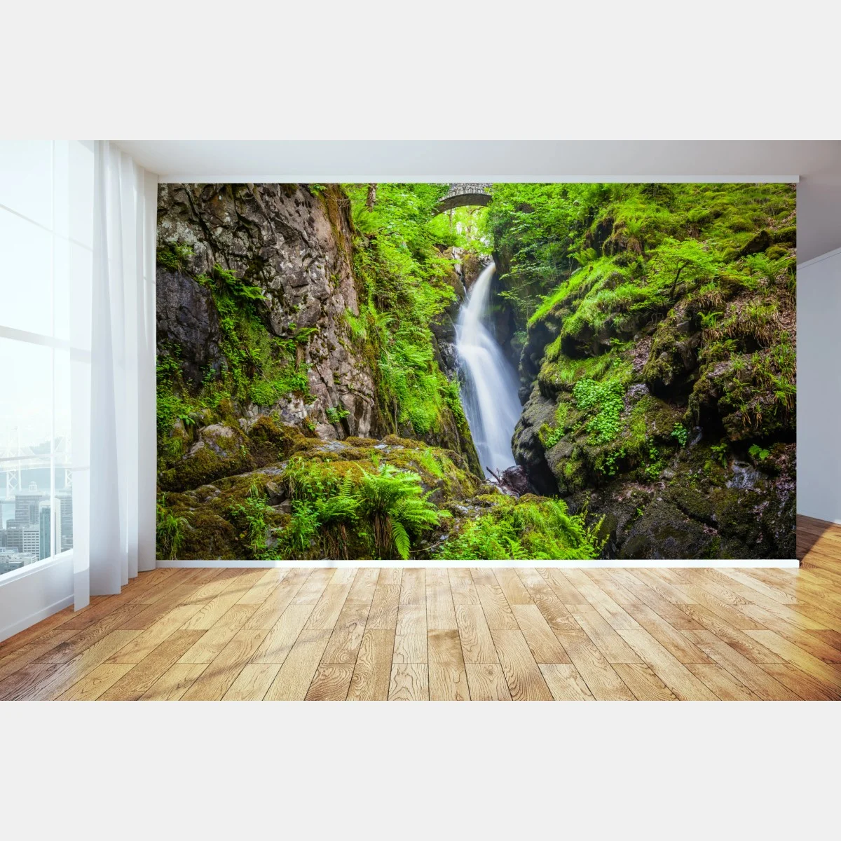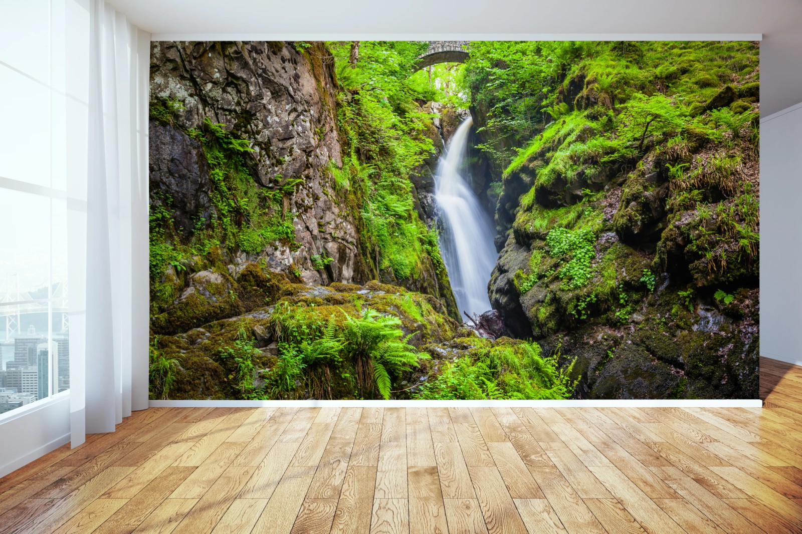 Fototapete Wasserfall in moosiger schlucht mit steinbrücke