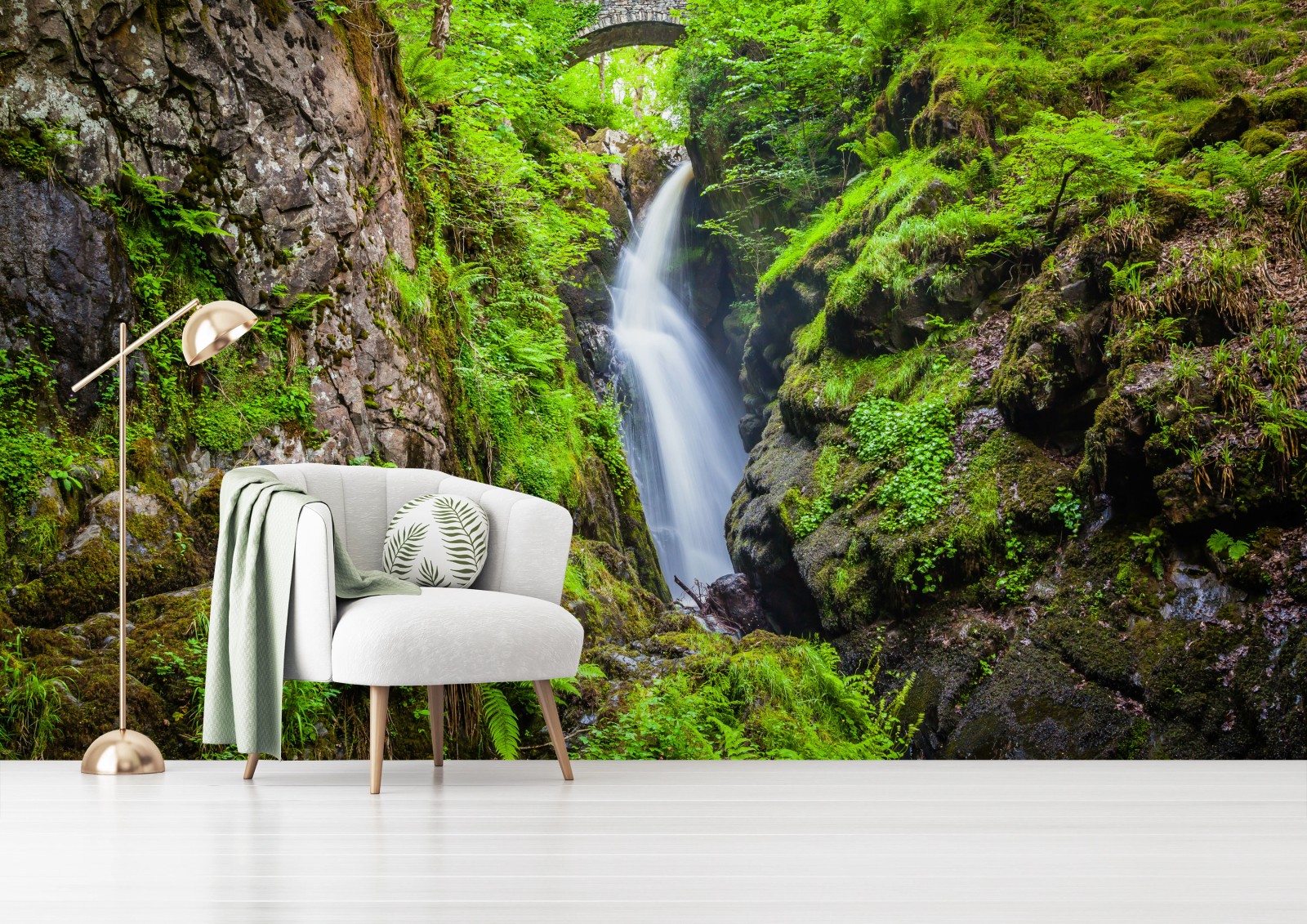 Fototapete Wasserfall in moosiger schlucht mit steinbrücke