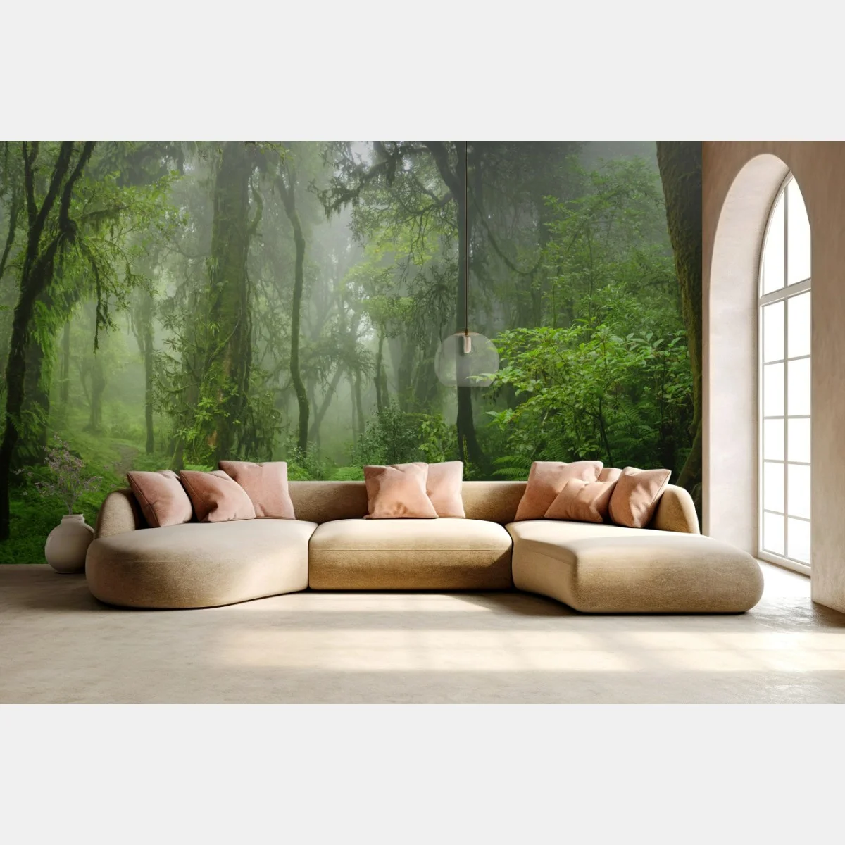 Erleben Sie die ruhige Atmosphäre eines nebligen tropischen Dschungels mit üppigem Grün und einem gewundenen Waldpfad, perfekt um Natur ins Zuhause zu holen.MehrWeniger
