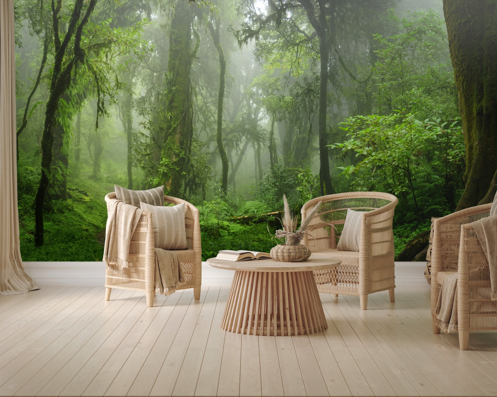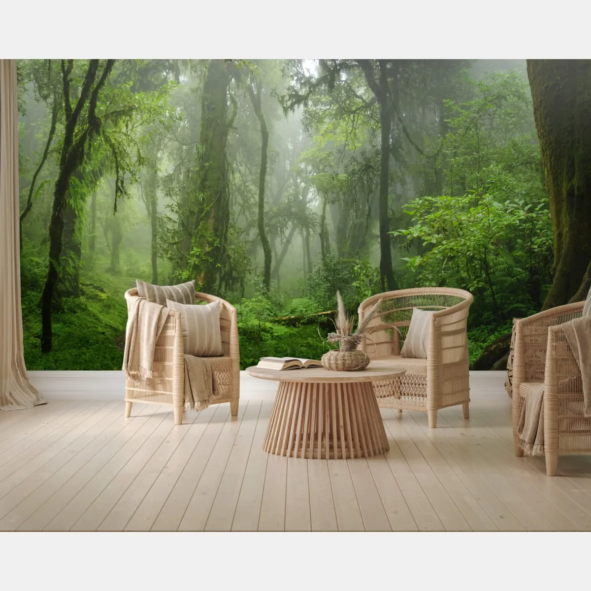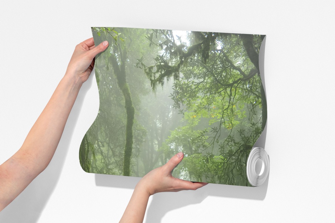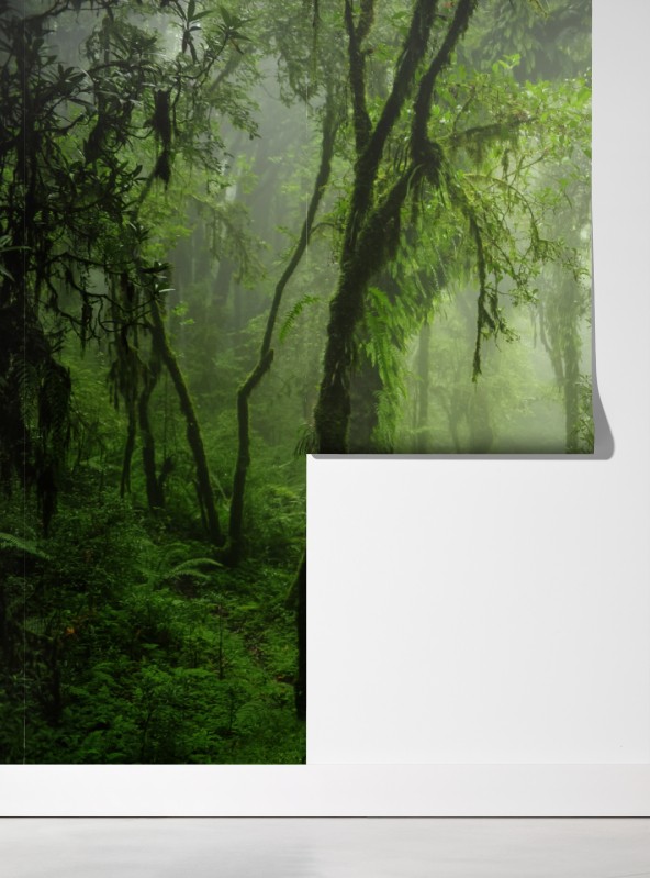 Erleben Sie die ruhige Atmosphäre eines nebligen tropischen Dschungels mit üppigem Grün und einem gewundenen Waldpfad, perfekt um Natur ins Zuhause zu holen.
