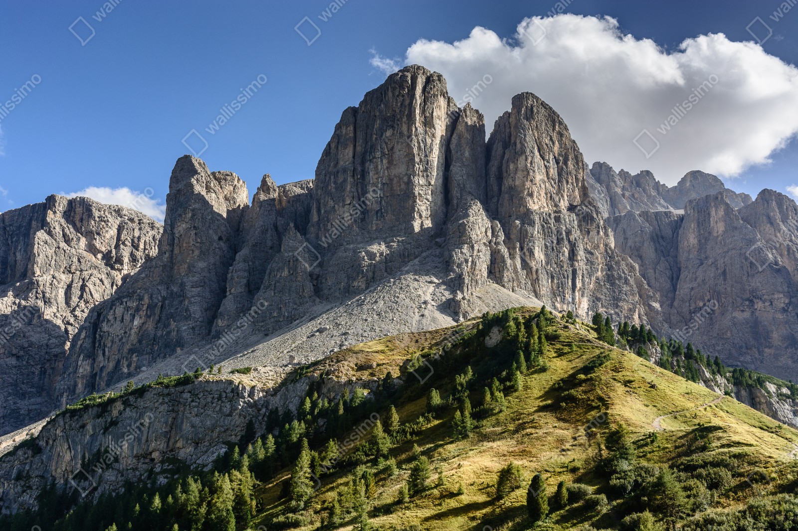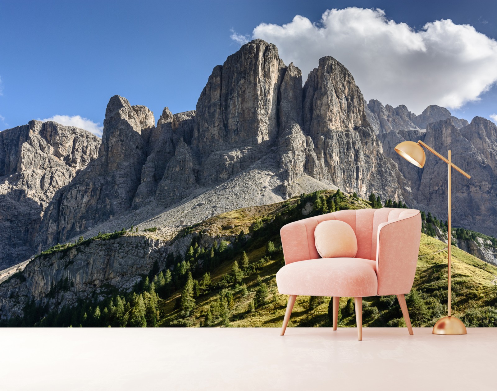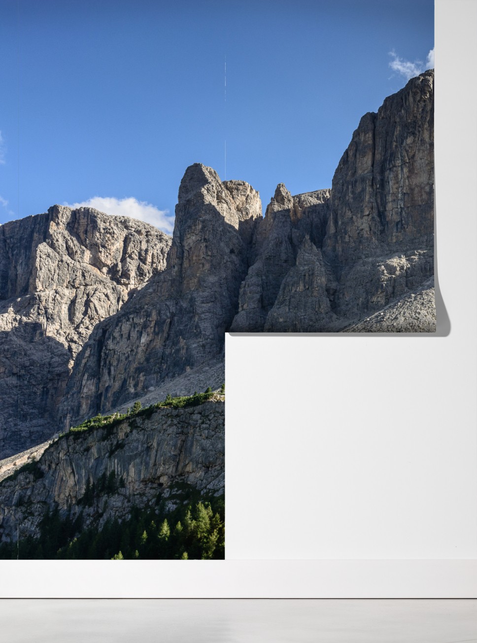 Ein atemberaubendes Bergpanorama mit imposanten Felswänden und sonnenbeschienenen Almhängen, ideal um natürliche Ruhe und Weite in Ihr Zuhause zu bringen.