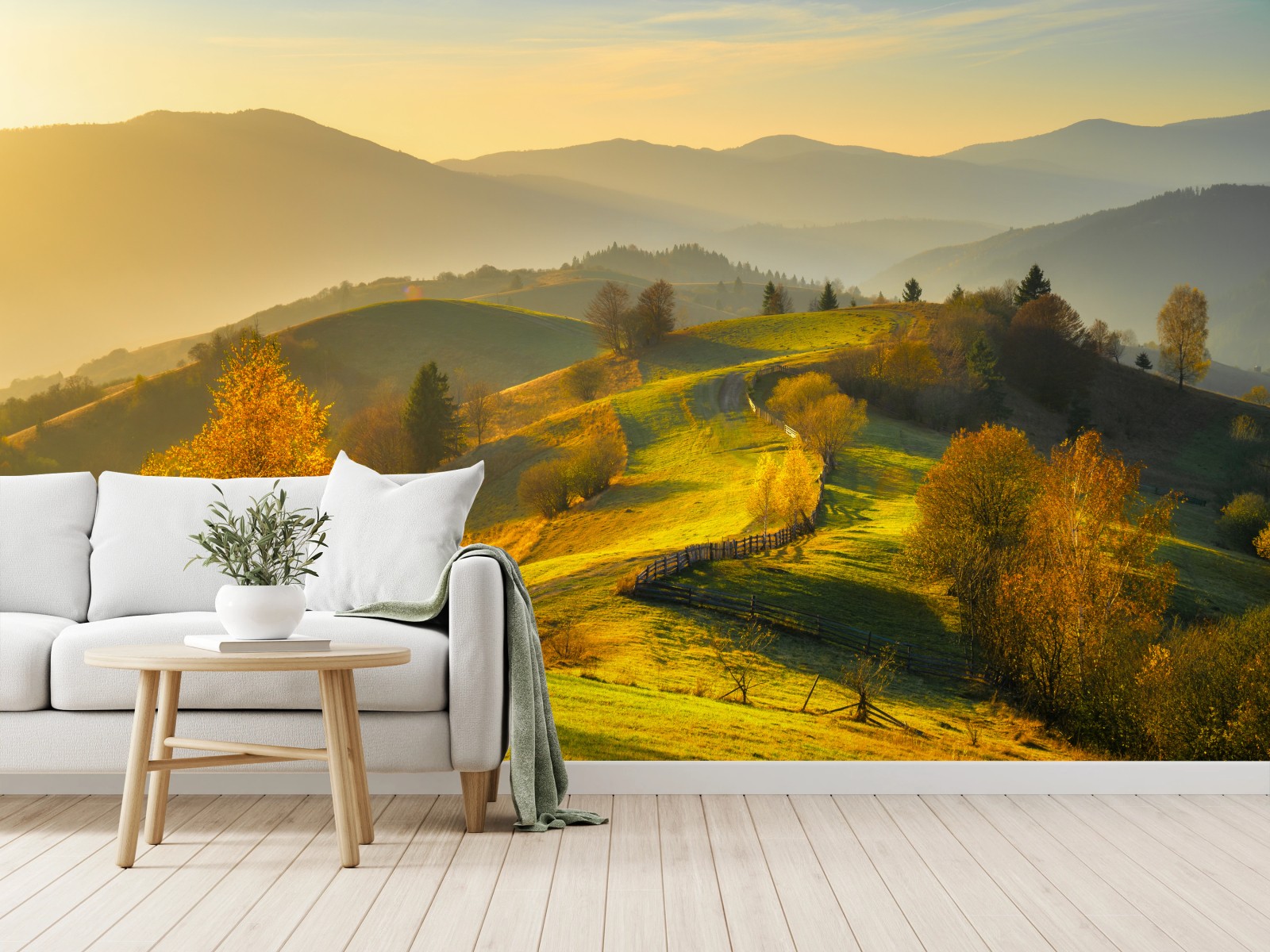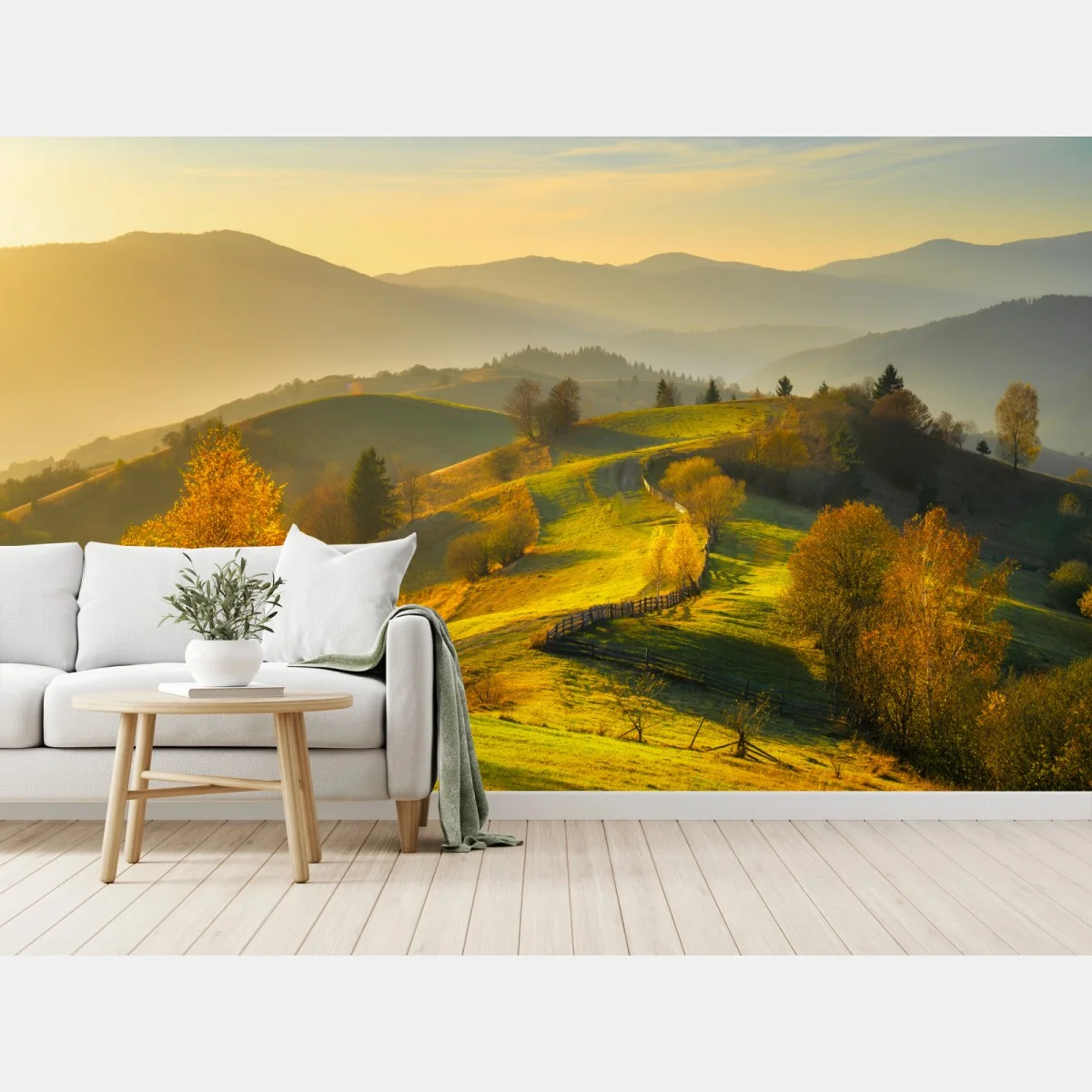 Fototapete Goldene herbsthügel bei sonnenuntergang