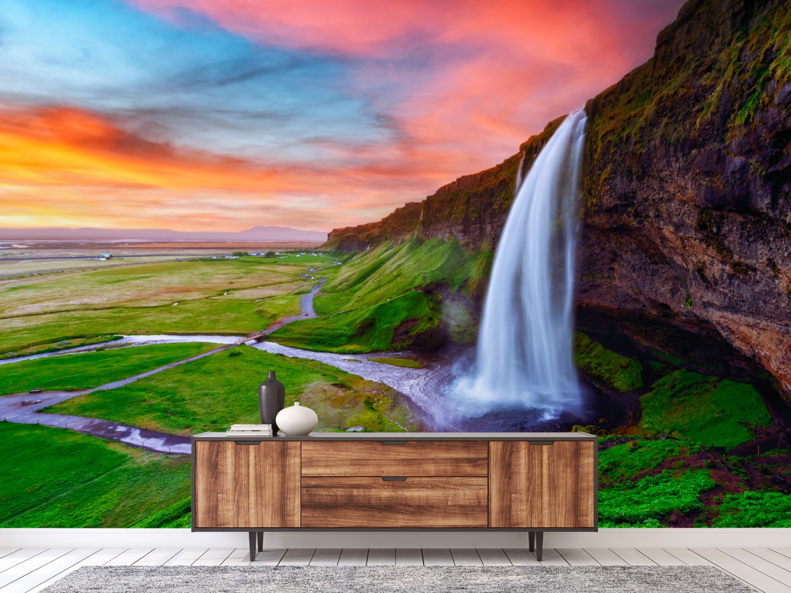 Fototapete wasserfall Seljalandsfoss bei sonnenuntergang