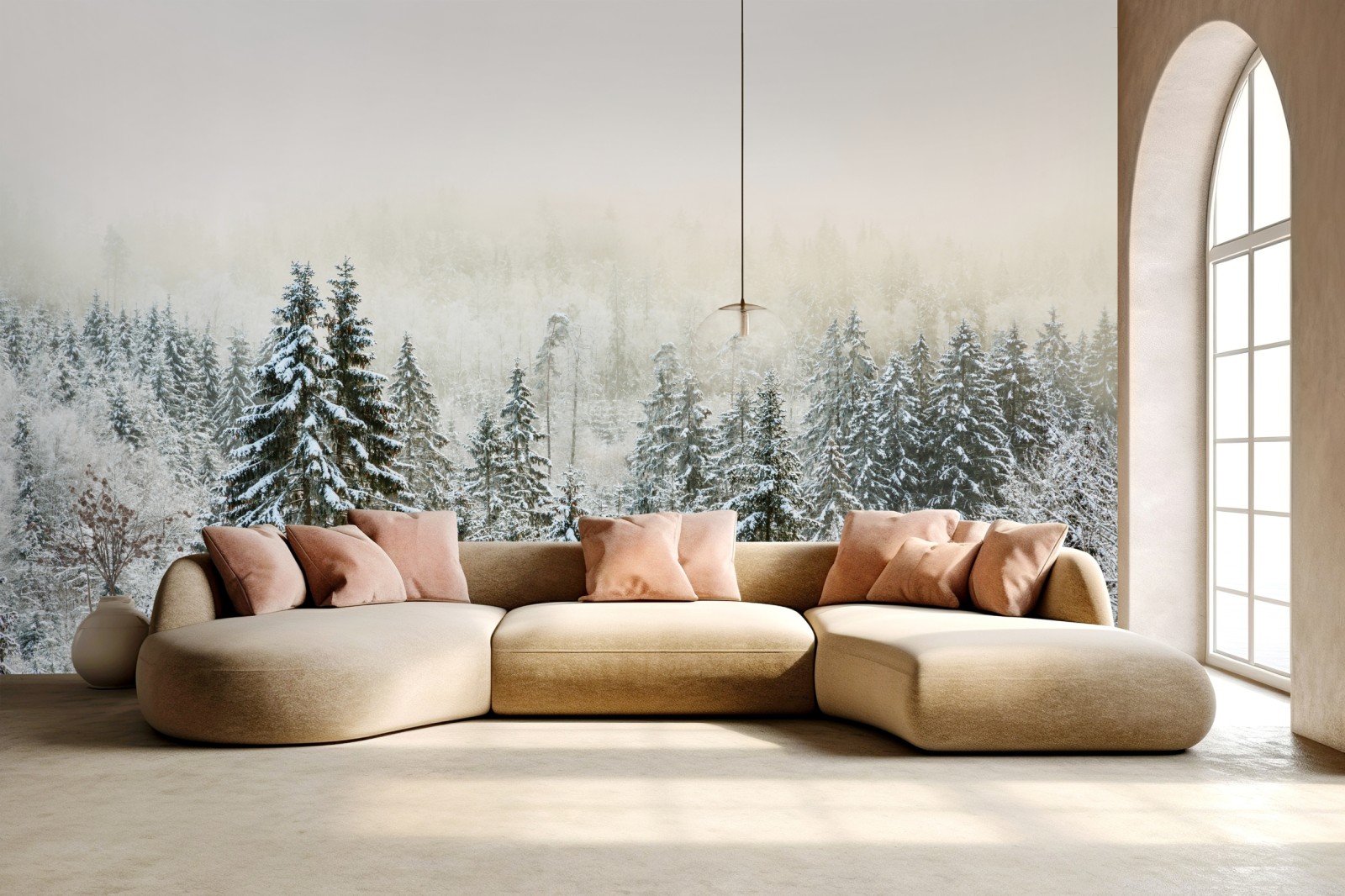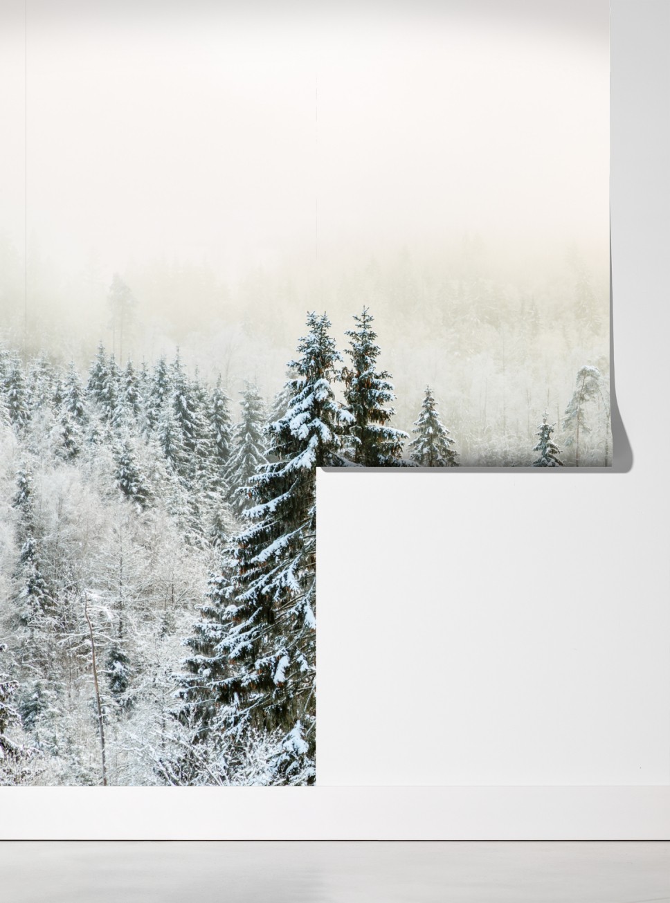 Eine ruhige Winterszene mit schneebedeckten Kiefern und sanftem Nebel, ideal um natürliche Gelassenheit in jeden Raum zu bringen.