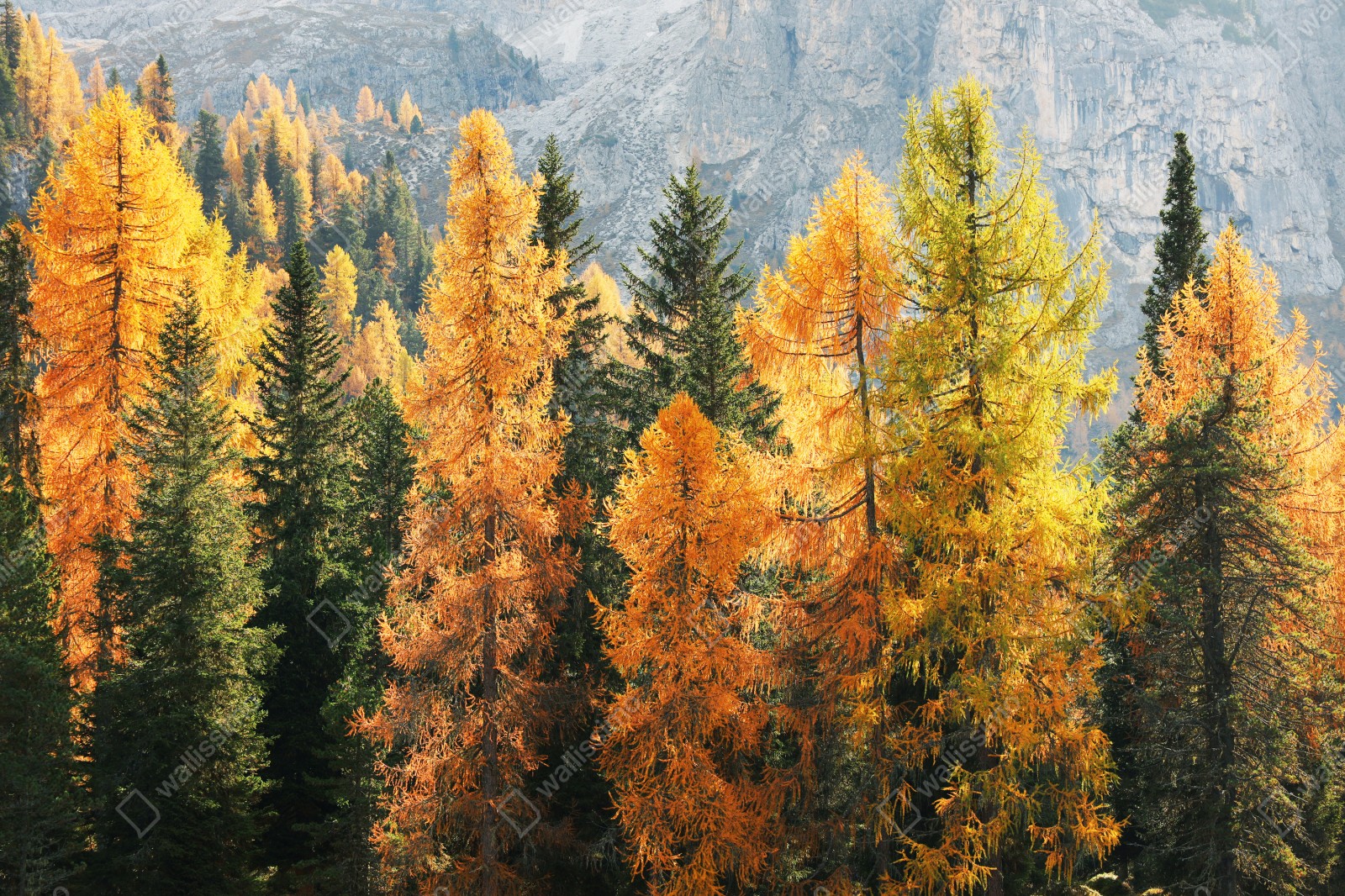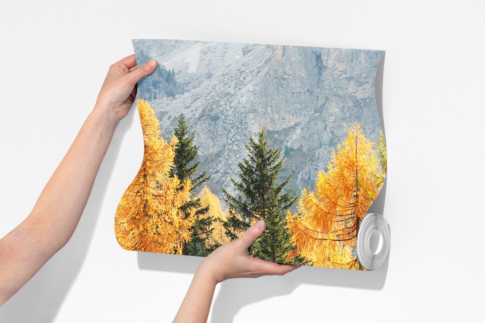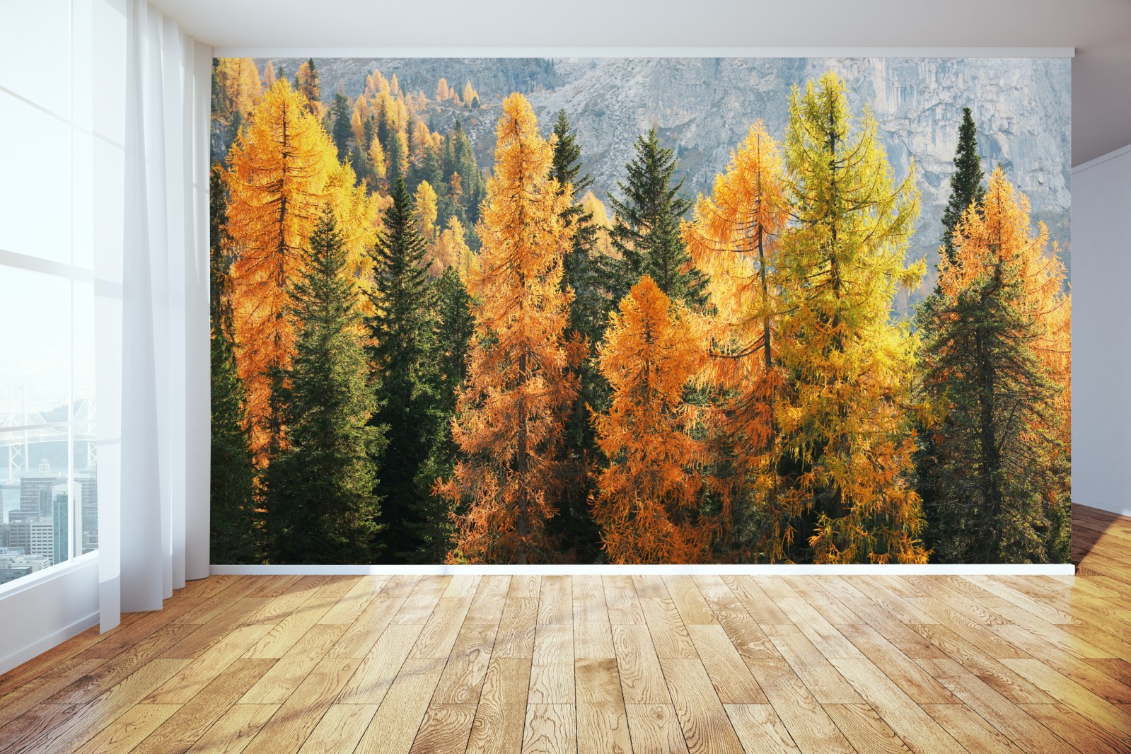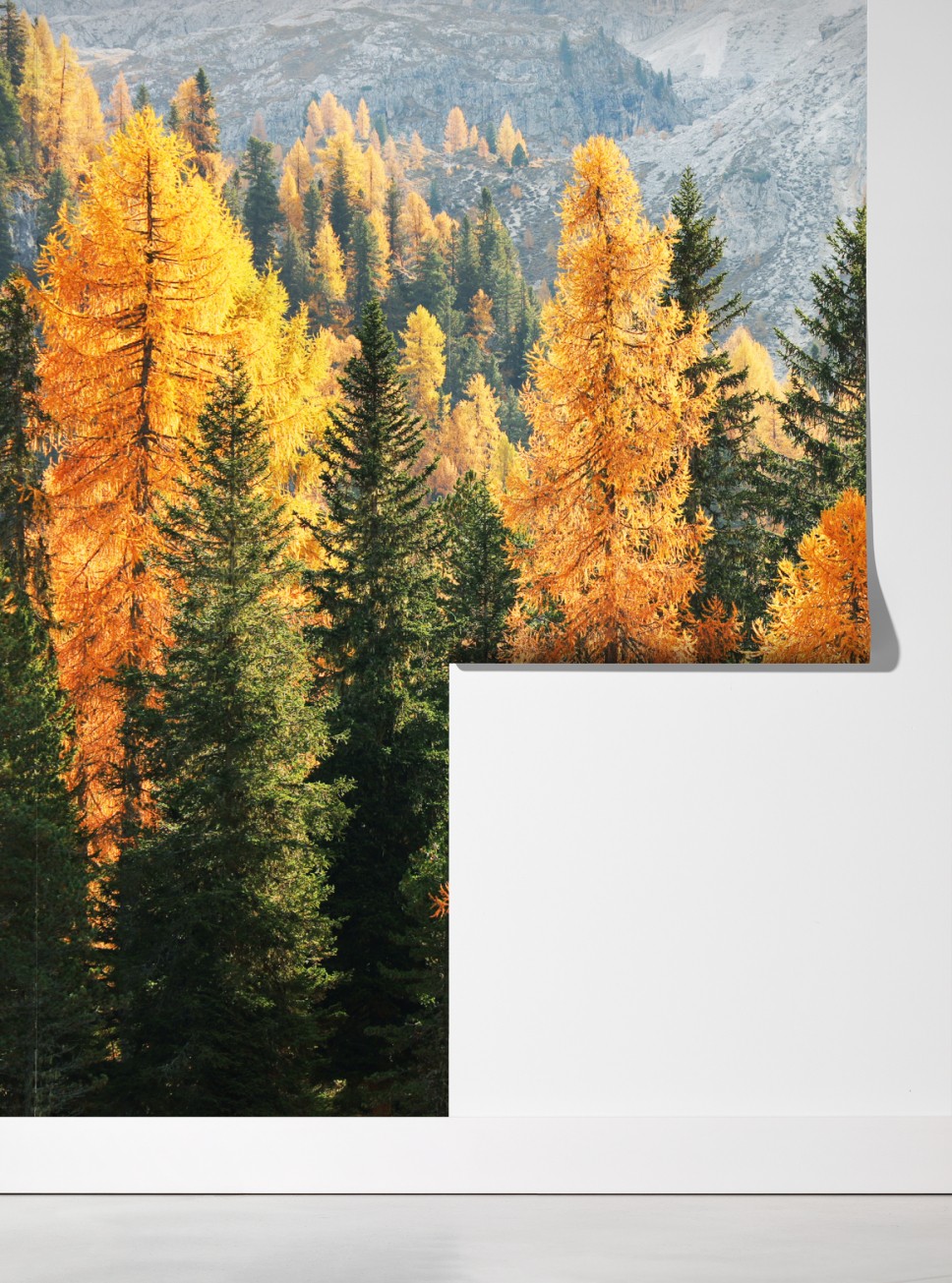 Lebendige herbstliche Waldszene mit goldenen Lärchen vor felsigem Bergpanorama, die Wärme und natürliche Ruhe in jeden Raum bringt.