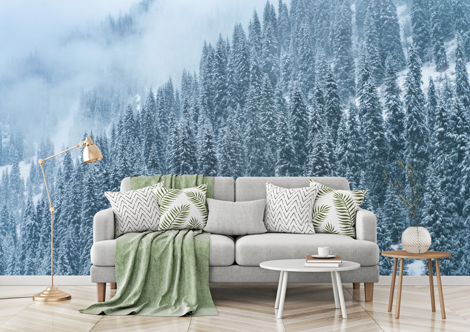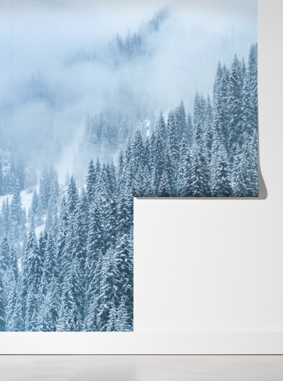 Bringen Sie ruhige Winterstimmung in Ihr Zuhause mit einem nebeligen, schneebedeckten Kiefernwald, der natürliche Schönheit ausstrahlt.