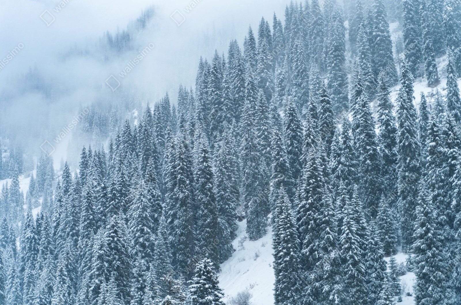 Fototapete nebeliger schneebedeckter kiefernwald