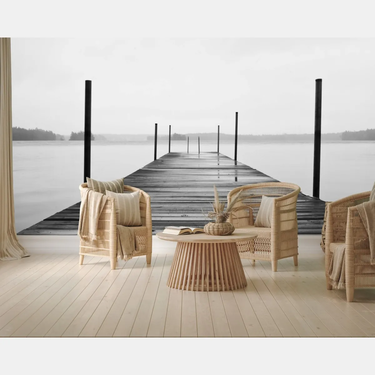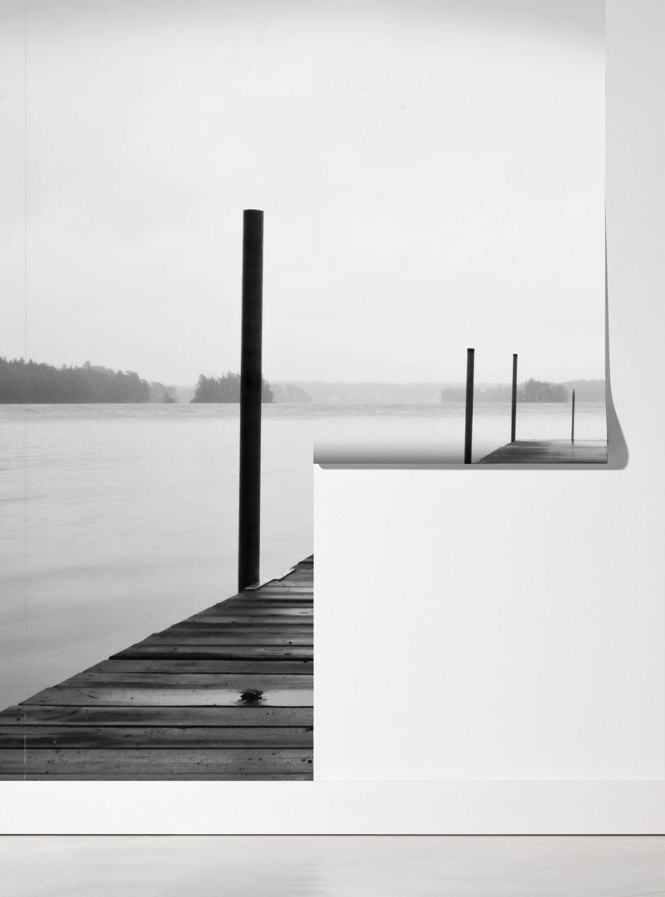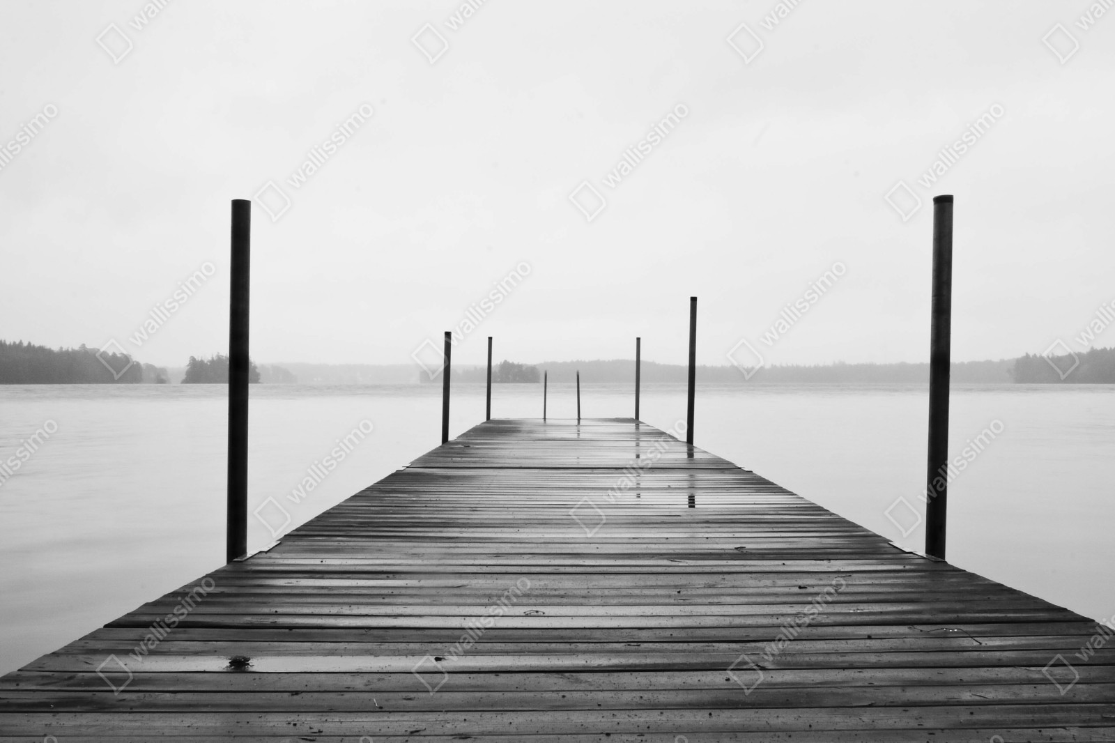 Fototapete nebliger steg am see in monochrom