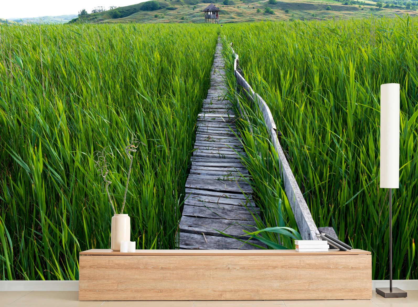 Fototapete Ruhiger grüner steg durch schilfland zur rustikalen hütte
