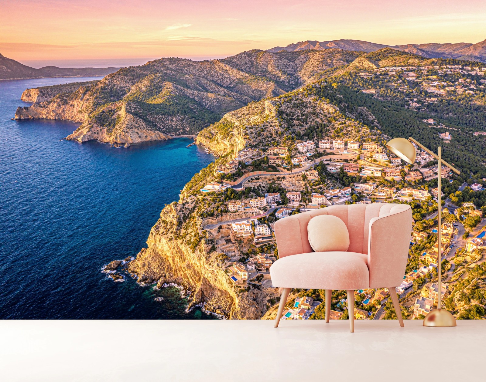 Bringen Sie die Ruhe eines mediterranen Sonnenuntergangs in Ihr Zuhause mit dieser Luftaufnahme eines Dorfes auf sonnenbeschienenen Klippen.MehrWeniger