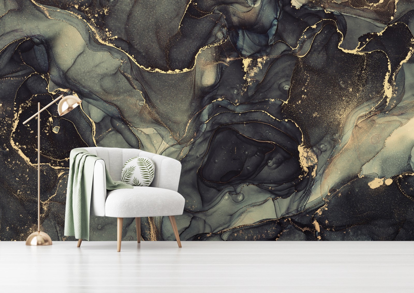 Fototapete Luxuriöse abstrakte alkoholtinten-kunst mit goldenen adern