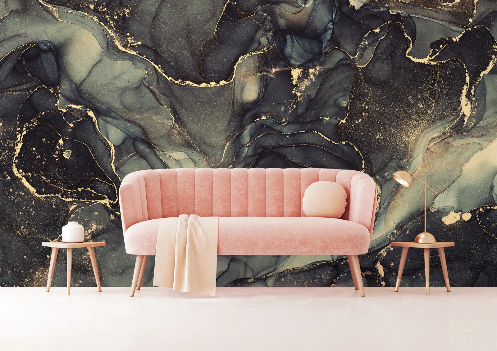 Fototapete Luxuriöse abstrakte alkoholtinten-kunst mit goldenen adern
