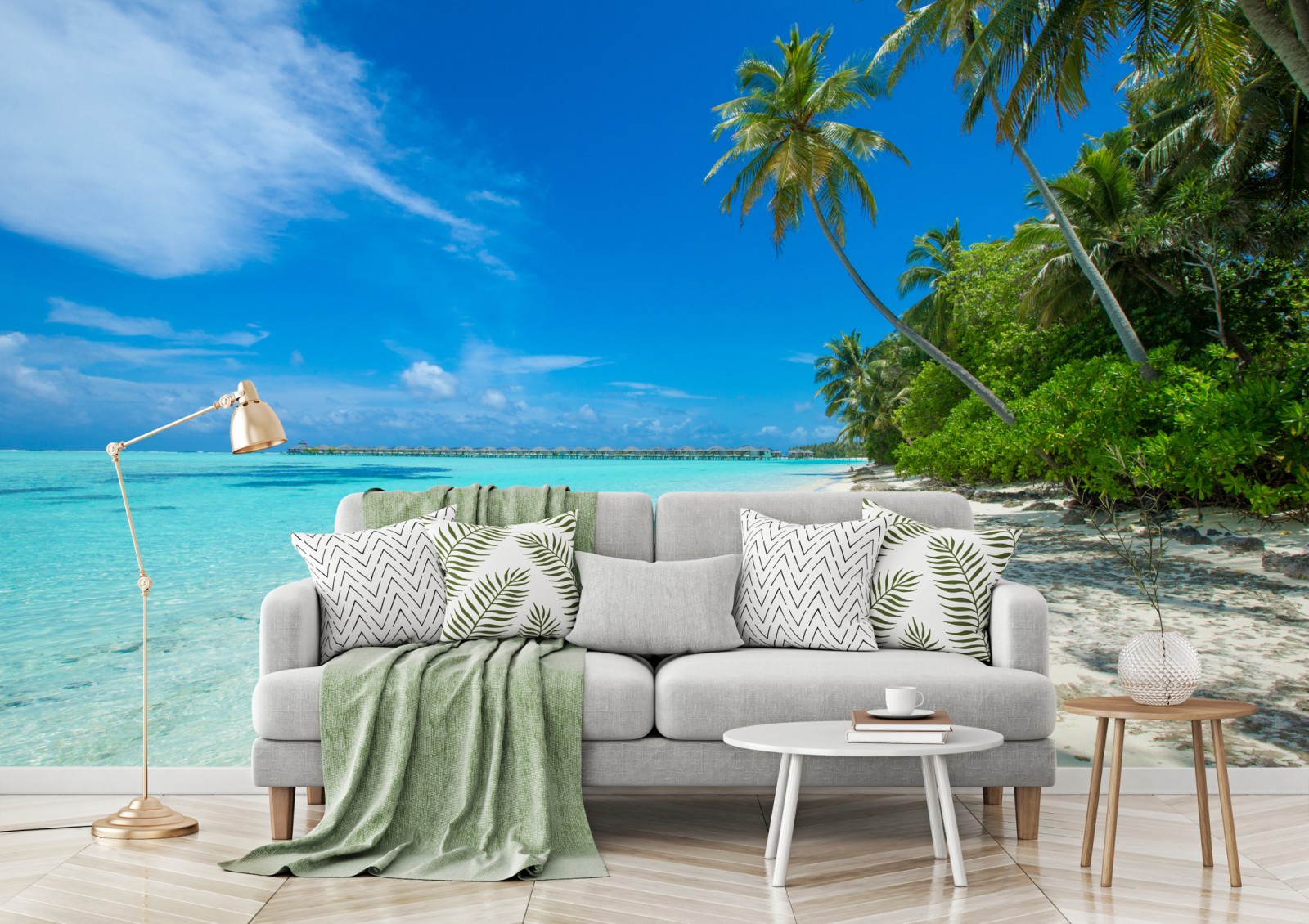 Erleben Sie eine ruhige tropische Oase mit türkisfarbenem Wasser, sanft wiegenden Palmen und makellosem weißen Sand, ideal um Urlaubsstimmung ins Zuhause zu bringen.