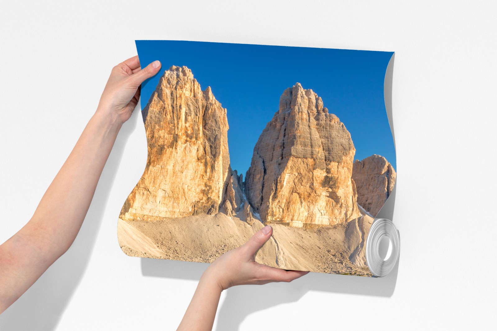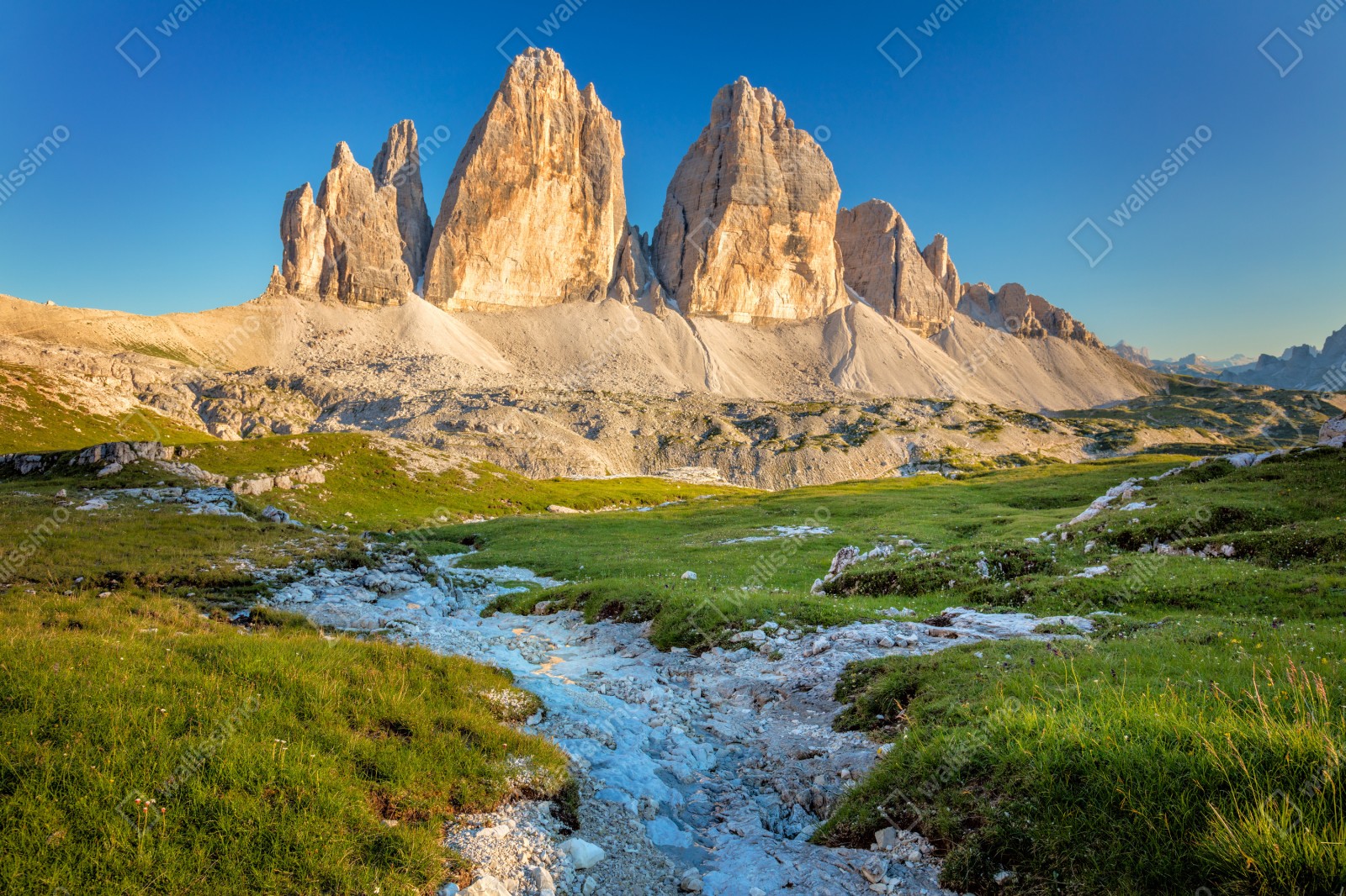 Bringen Sie die dramatische Schönheit der Dolomiten in Ihren Raum mit diesem lebendigen Panorama von Tre Cime di Lavaredo, das goldene Gipfel, grüne Wiesen und einen klaren blauen Himmel zeigt.