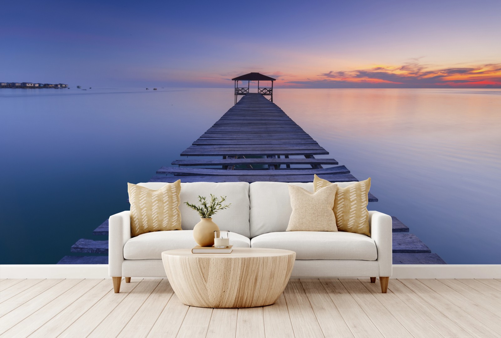 Bringen Sie ruhige Meeresstimmung in Ihr Zuhause mit einem minimalistischen Motiv eines Stegs bei Sonnenuntergang.MehrWeniger
