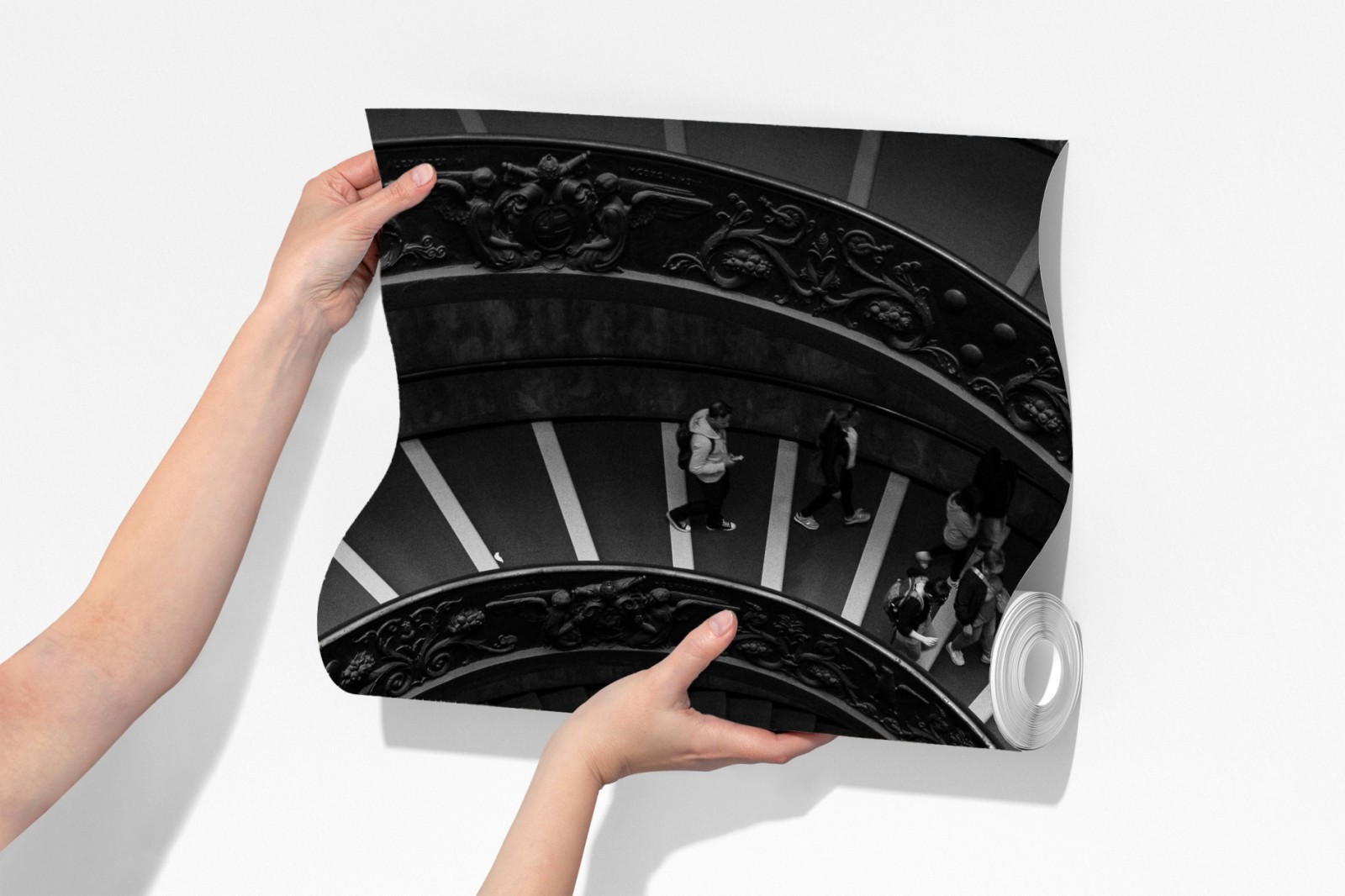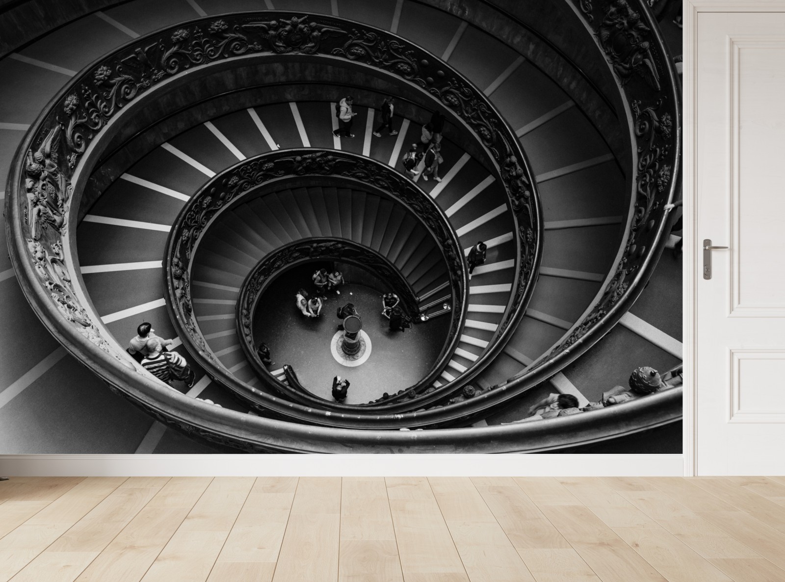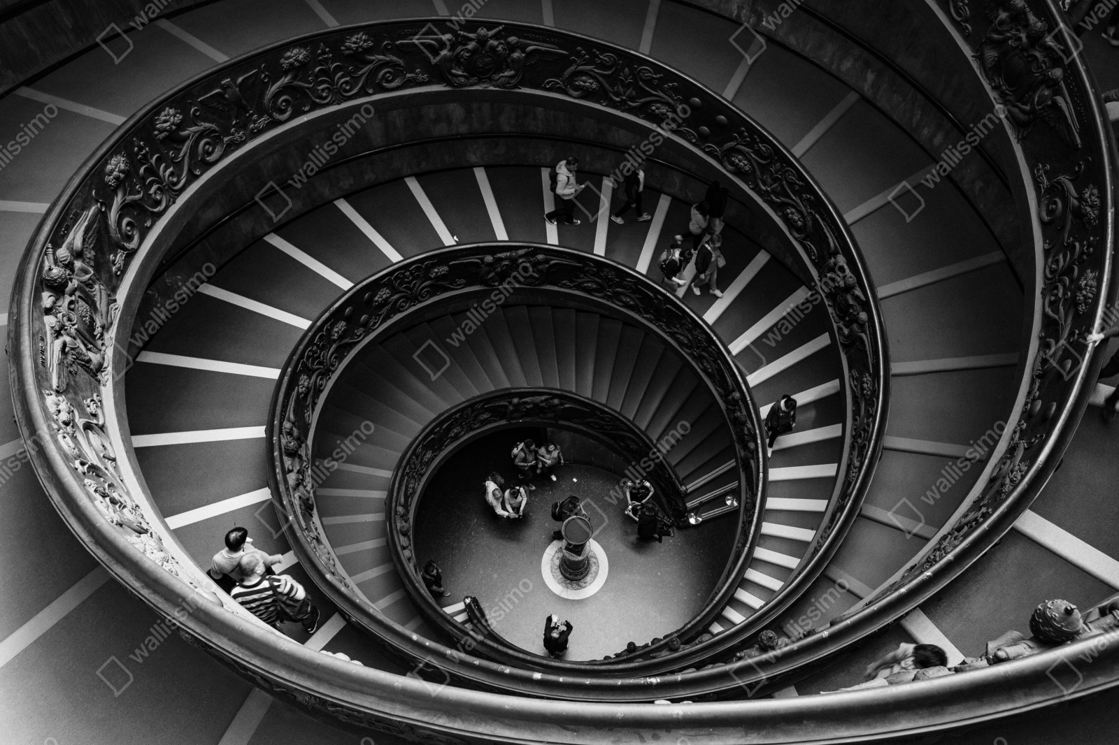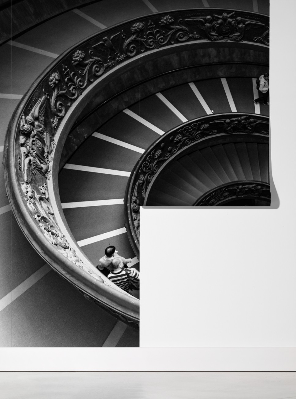 Erleben Sie zeitlose architektonische Eleganz mit diesem eindrucksvollen monochromen Bild einer Spiraltreppe, ideal für moderne Innenräume.