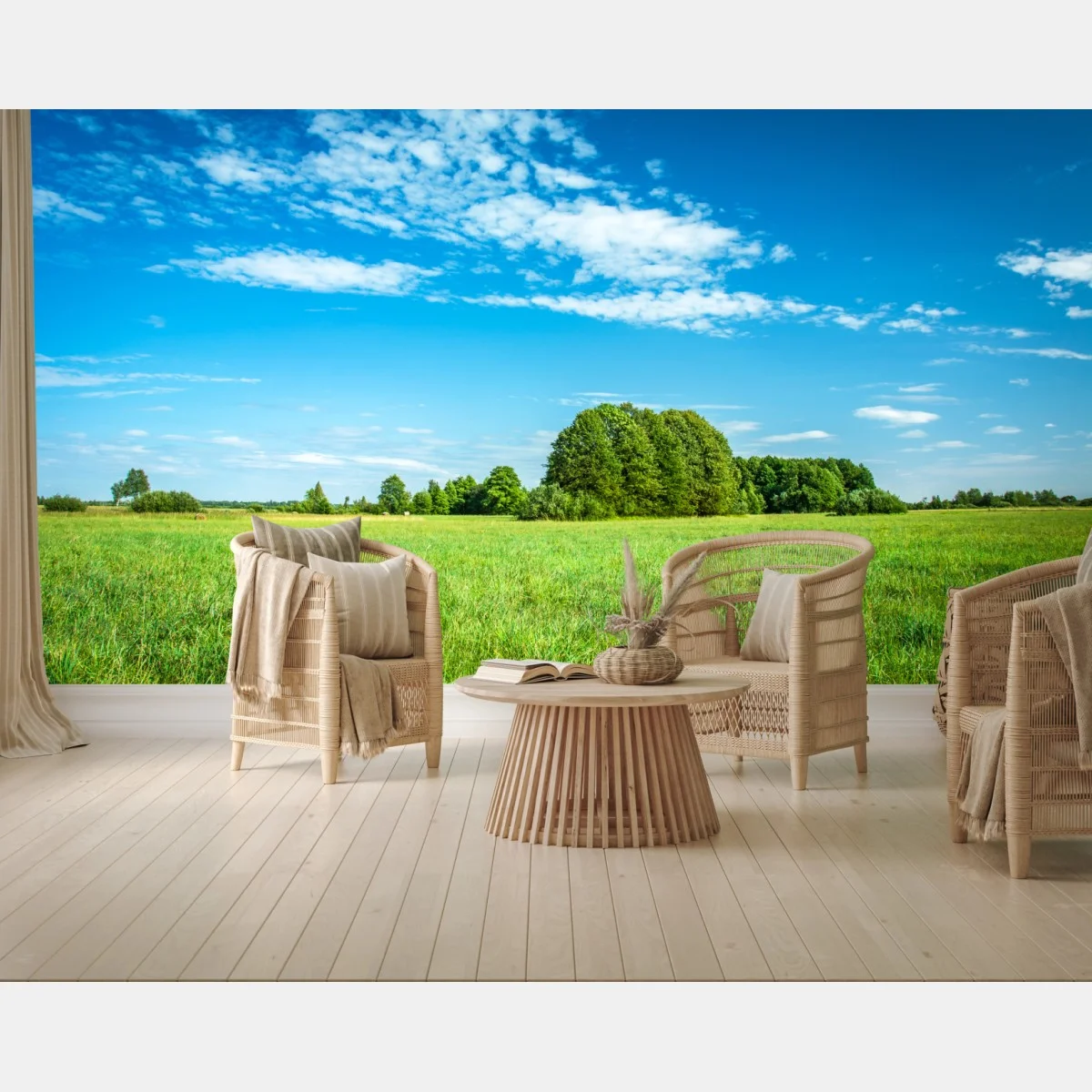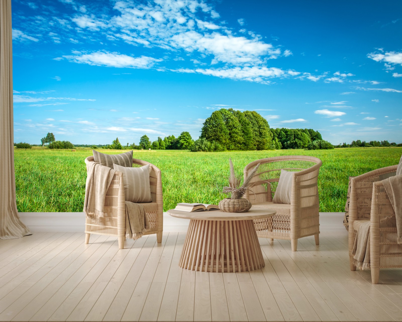 Fototapete Sonnige grüne wiese unter blauem himmel