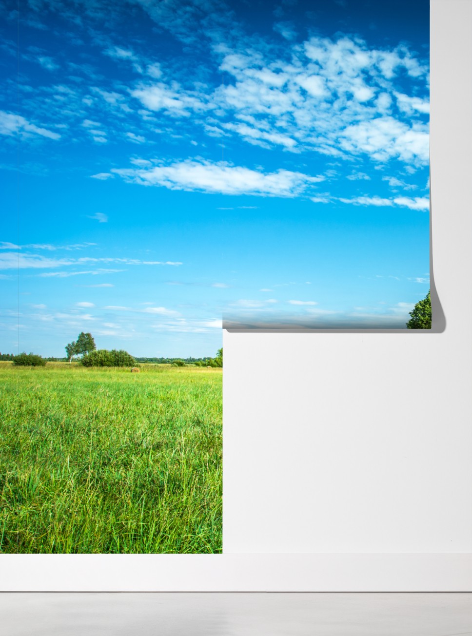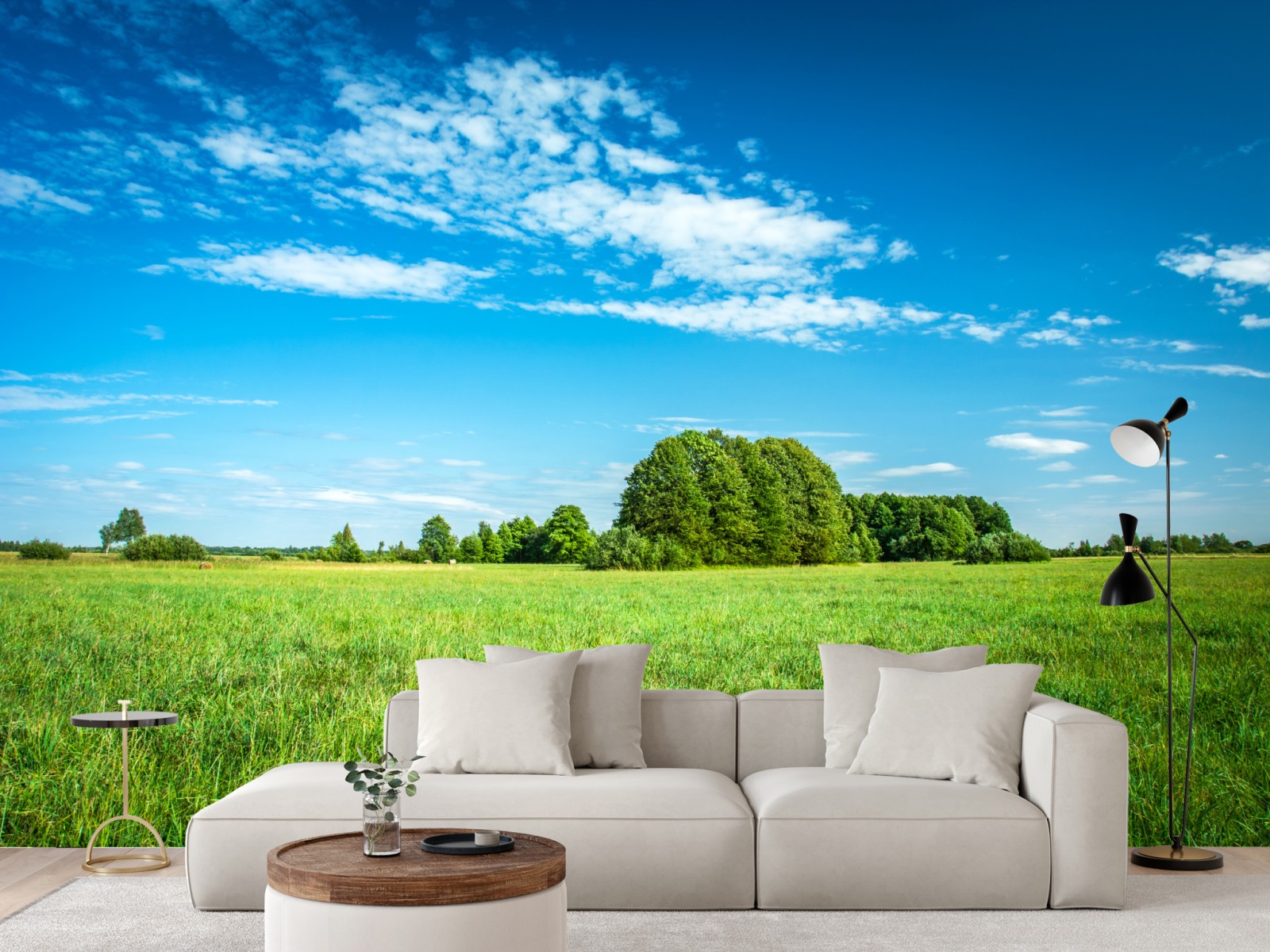 Fototapete sonnige grüne wiese unter blauem himmel – Wallnifity®