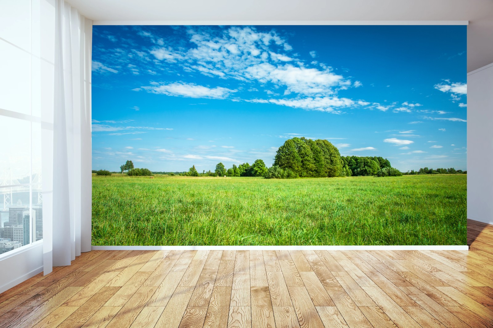Fototapete Sonnige grüne wiese unter blauem himmel
