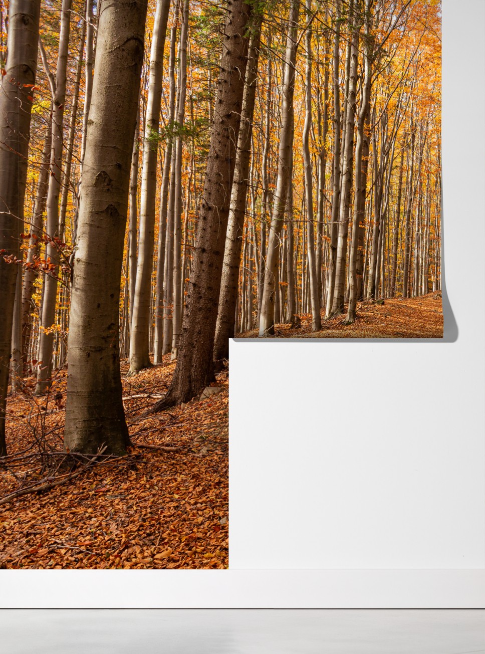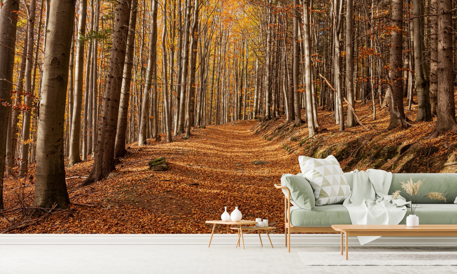 Bringen Sie das warme Leuchten des Herbstes in Ihr Zuhause mit diesem ruhigen Waldweg-Motiv, das natürliche Tiefe und eine beruhigende Atmosphäre schafft.
