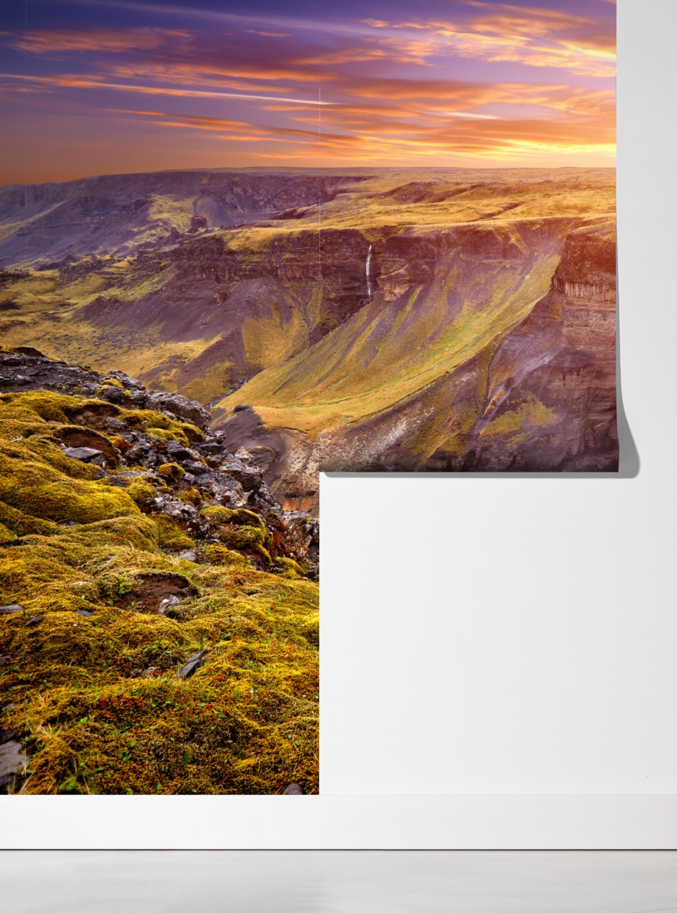Bringen Sie die dramatische Schönheit von Haifoss in Ihr Zuhause, eingefangen in der goldenen Stunde mit stürzenden Wassermassen, schroffen Klippen und üppigem Moos als beeindruckendem Blickfang.