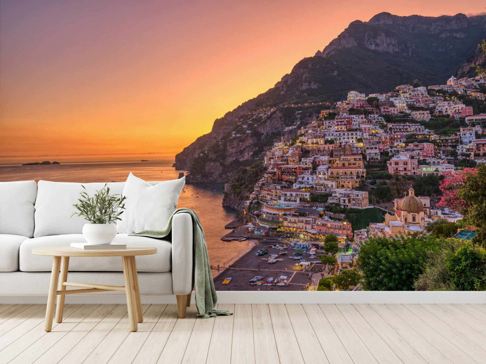 Bringen Sie die goldenen Farbtöne eines Küstensonnenuntergangs in Ihr Zuhause mit dieser Panoramaaufnahme von Positano an der Amalfiküste.