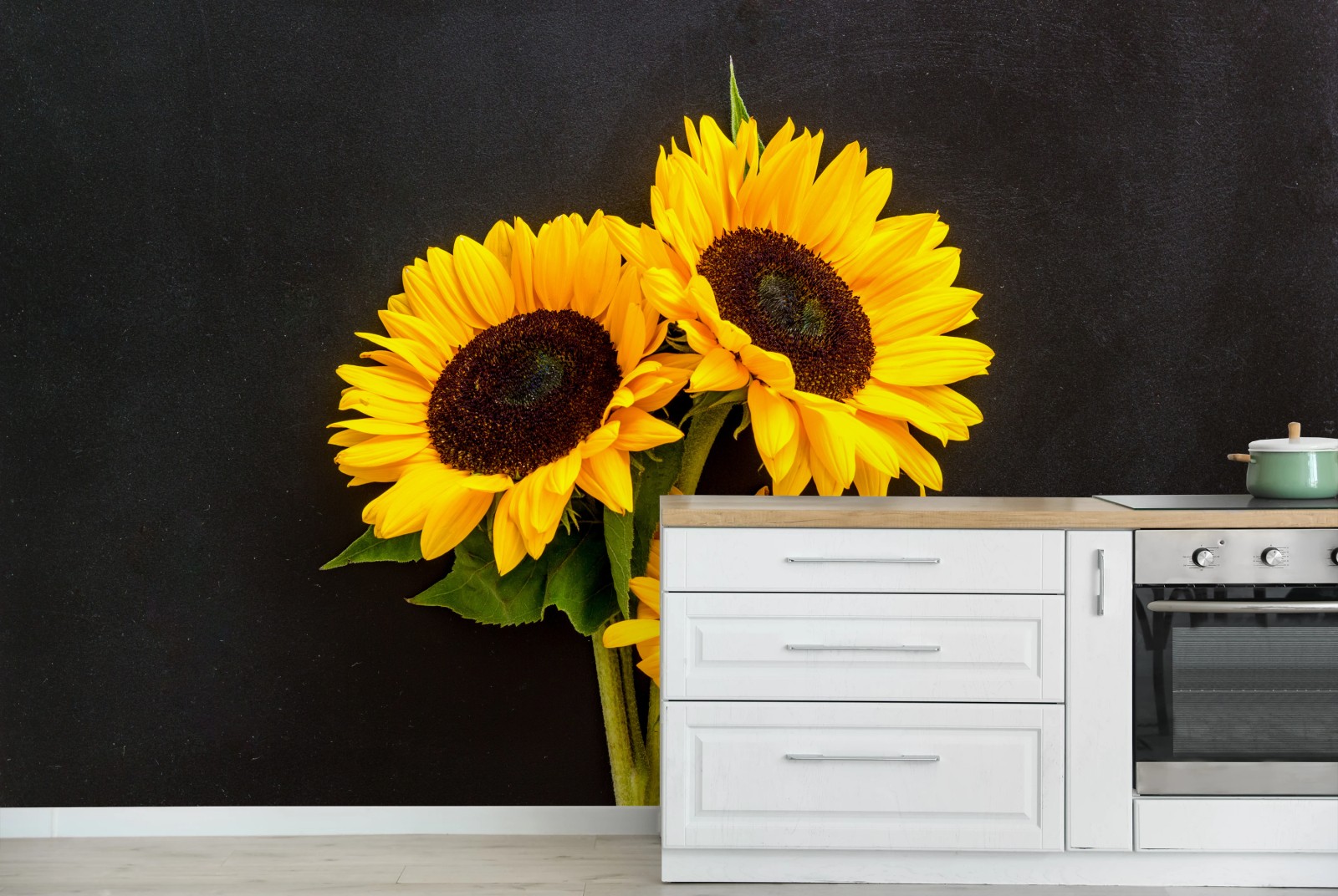 Bringen Sie Wärme und Fröhlichkeit in Ihr Zuhause mit leuchtenden Sonnenblumen vor kontrastierendem schwarzem Hintergrund, ideal als dekorativer Blickfang.MehrWeniger