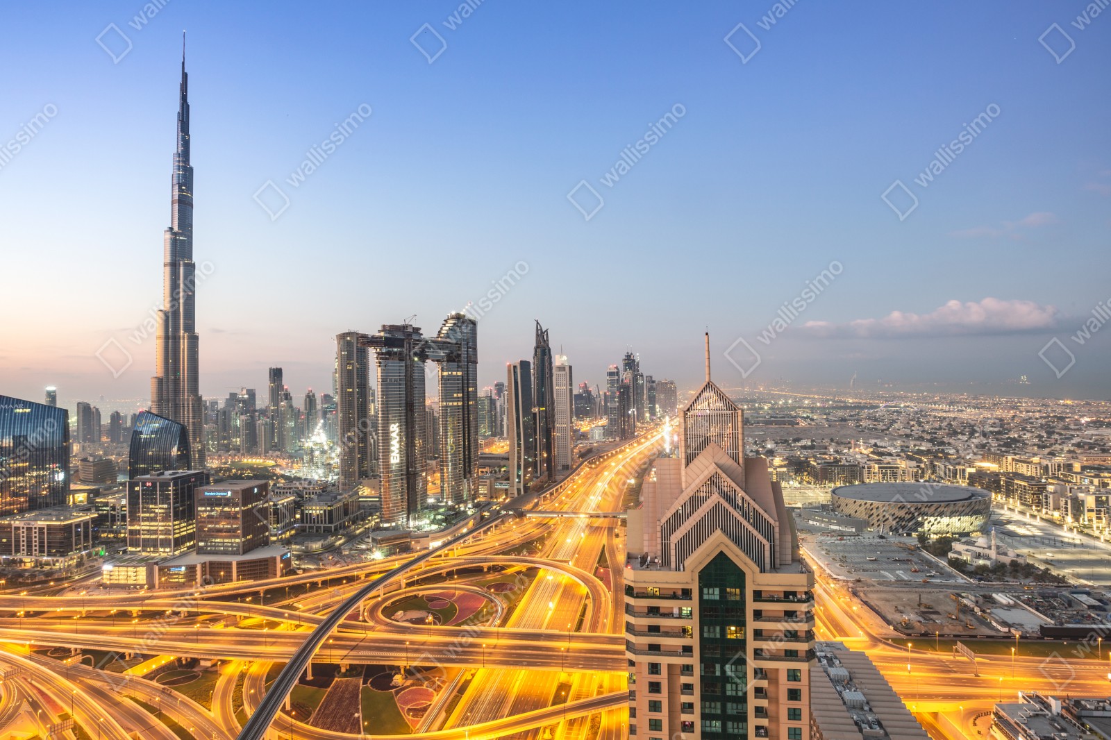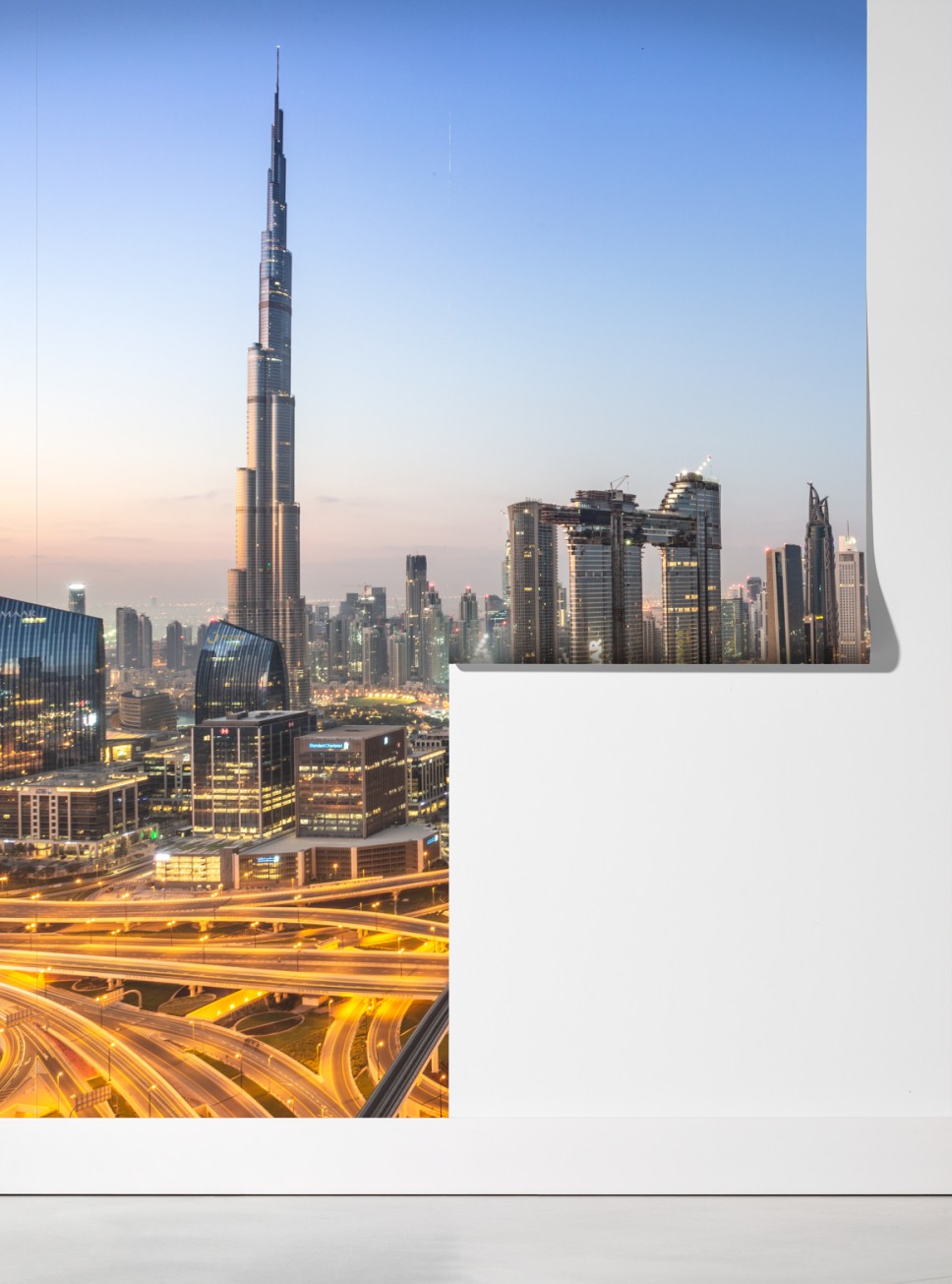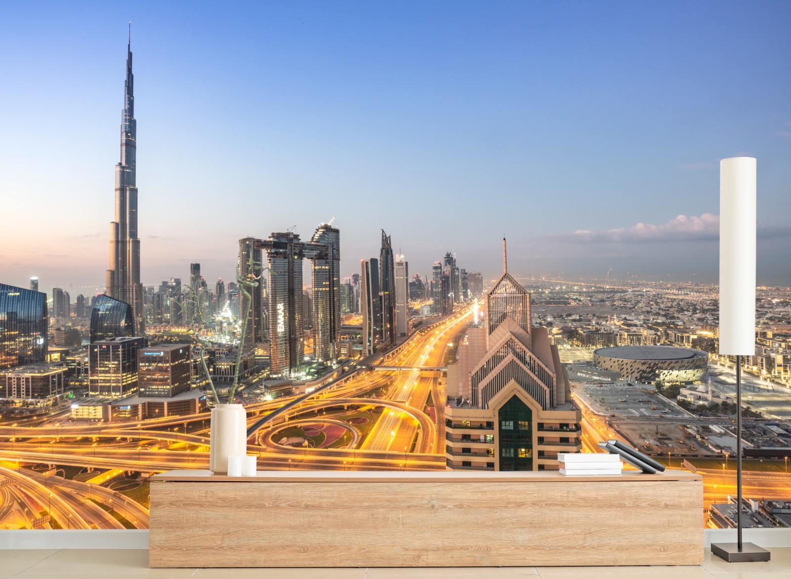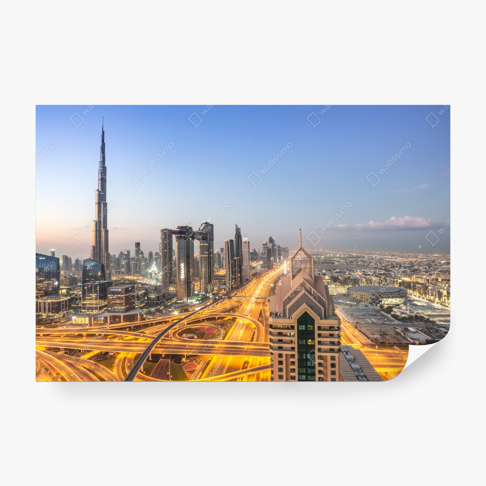 Verleihen Sie Ihrem Raum urbanen Charme mit dieser Skylineaufnahme von Dubai bei Dämmerung, die leuchtende Straßen und hohe Wolkenkratzer in einer modernen Komposition vereint.