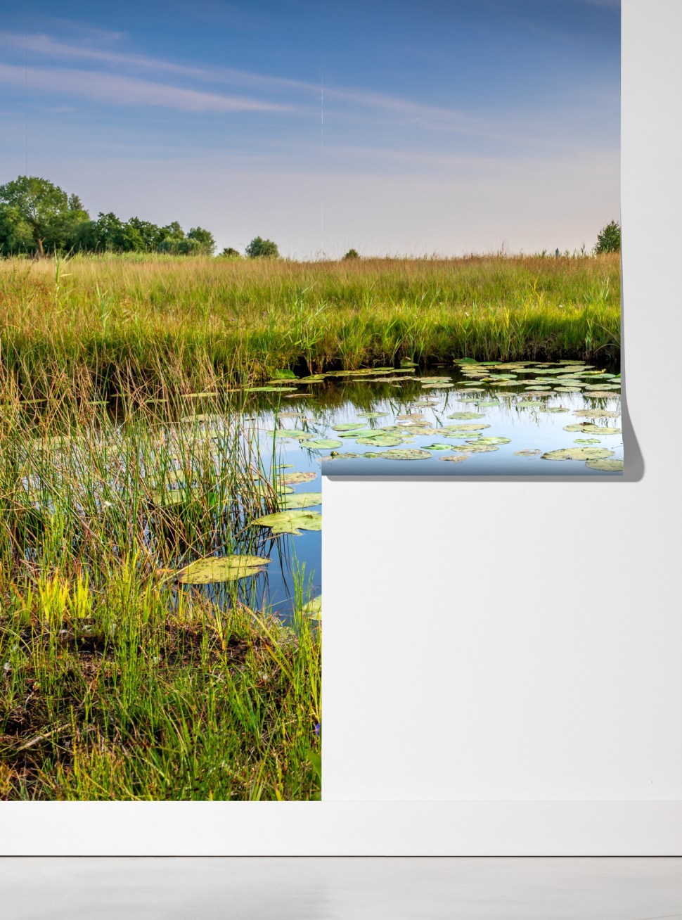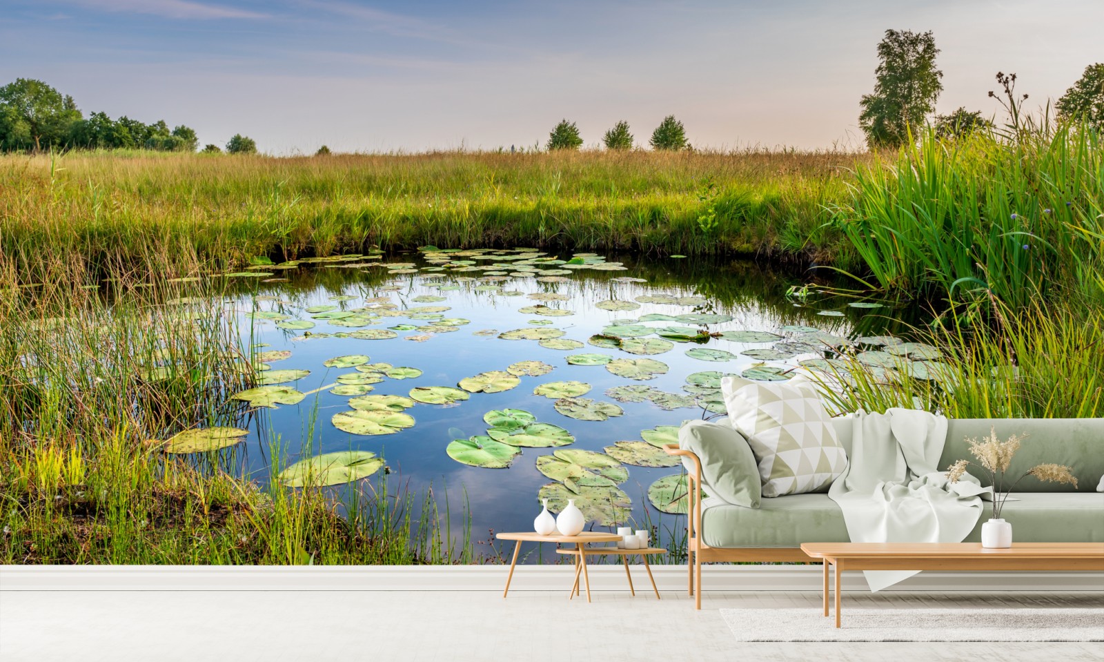 Bringen Sie Ruhe ins Zuhause mit einer friedlichen Szenerie aus Seerosen und üppigen Sumpfgräsern.